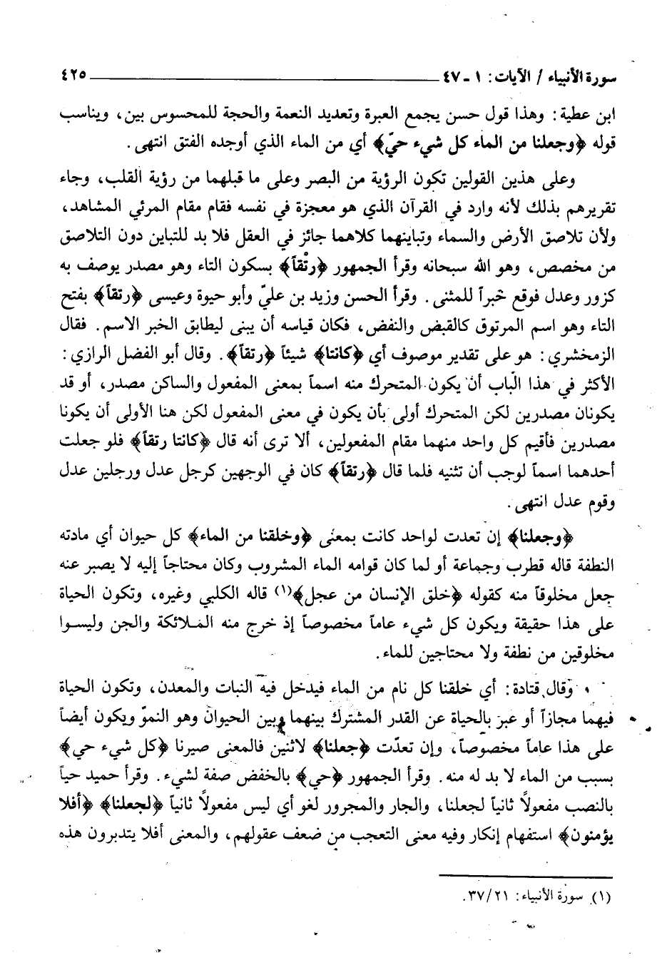وَعَلَى هَذَيْنِ الْقَوْلَيْنِ تَكُونُ الرُّؤْيَةُ مِنَ الْبَصَرِ وَعَلَى مَا قَبْلَهُمَا مِنْ رُؤْيَةِ الْقَلْبِ، وَجَاءَ تَقْرِيرُهُمْ بِذَلِكَ لِأَنَّهُ وَارِدٌ فِي الْقُرْآنِ الَّذِي هُوَ مُعْجِزَةٌ فِي نَفْسِهِ فَقَامَ مَقَامَ الْمَرْئِيِّ الْمُشَاهَدِ، وَلِأَنَّ تَلَاصُقَ الْأَرْضِ وَالسَّمَاءِ وَتَبَايُنَهُمَا كِلَاهُمَا جَائِزٌ فِي الْعَقْلِ فَلَا بُدَّ لِلتَّبَايُنِ دُونَ التَّلَاصُقِ مِنْ مُخَصِّصٍ، وَهُوَ اللَّهُ سُبْحَانَهُ وَقَرَأَ الْجُمْهُورُ رَتْقاً بِسُكُونِ التَّاءِ وَهُوَ مَصْدَرٌ يُوصَفُ بِهِ كَزَوْرٍ وَعَدْلٍ فَوَقَعَ خَبَرًا لِلْمُثَنَّى. وَقَرَأَ الْحَسَنُ وَزَيْدُ بْنُ عَلِيٍّ وَأَبُو حَيْوَةَ وَعِيسَى رَتْقاً بِفَتْحِ التَّاءِ وَهُوَ اسْمُ الْمَرْتُوقِ كَالْقَبْضِ وَالنَّفْضِ، فَكَانَ قِيَاسُهُ أَنْ يُبْنَى لِيُطَابِقَ الْخَبَرُ الِاسْمَ. فَقَالَ الزَّمَخْشَرِيُّ: هُوَ عَلَى تَقْدِيرِ مَوْصُوفٍ أَيْ كانَتا شَيْئًا رَتْقاً. وَقَالَ أَبُو الْفَضْلِ الرَّازِيُّ: