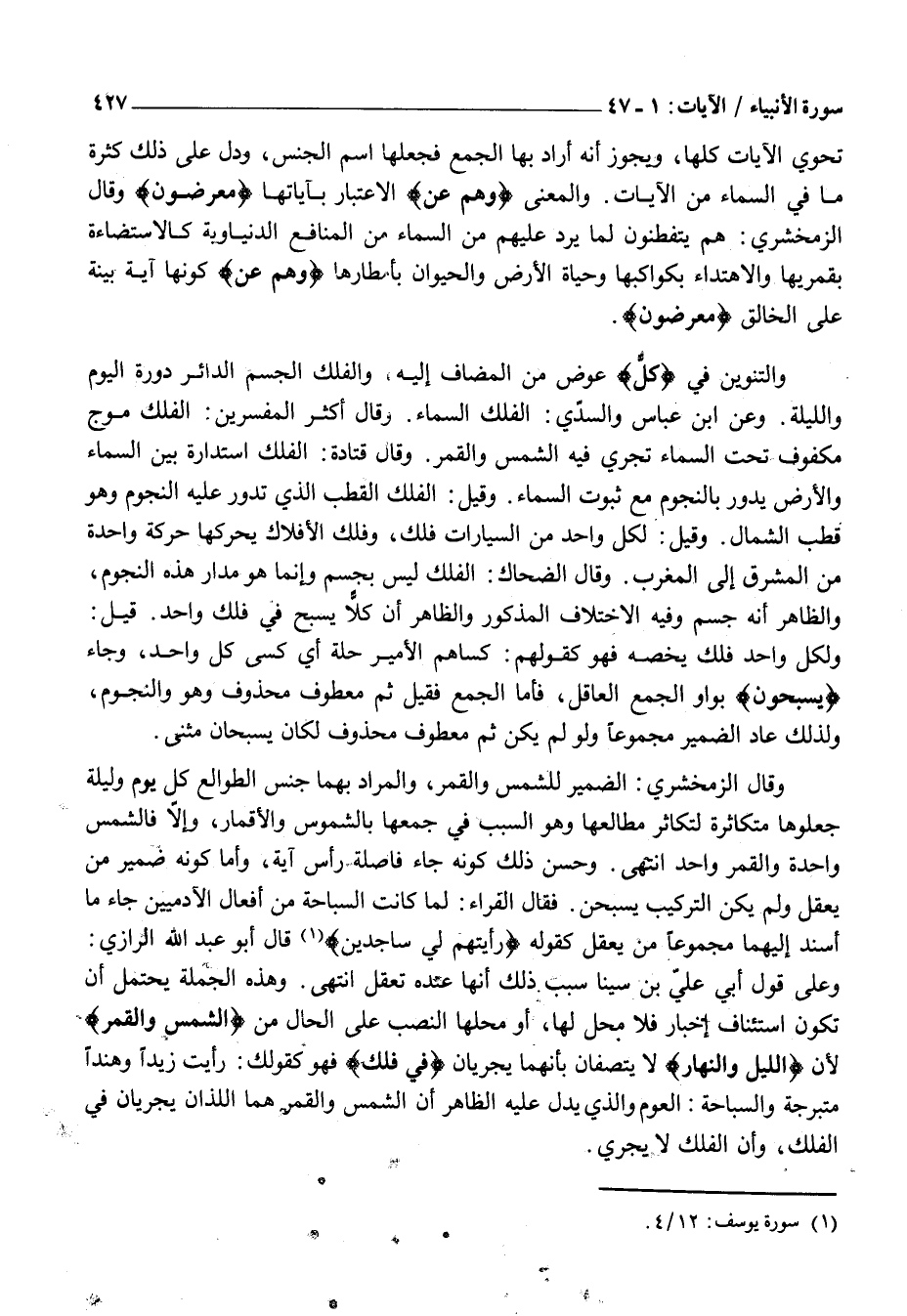 وَالتَّنْوِينُ فِي كُلٌّ عِوَضٌ مِنَ الْمُضَافِ إِلَيْهِ، وَالْفَلَكُ الْجِسْمُ الدَّائِرُ دَوْرَةَ الْيَوْمِ وَاللَّيْلَةِ. وَعَنِ ابْنِ عَبَّاسٍ وَالسُّدِّيُّ: الْفَلَكُ السَّمَاءُ. وَقَالَ أَكْثَرُ الْمُفَسِّرِينَ: الْفَلَكُ مَوْجٌ مَكْفُوفٌ تَحْتَ السَّمَاءِ تَجْرِي فِيهِ الشَّمْسُ وَالْقَمَرُ. وَقَالَ قَتَادَةُ: الْفَلَكُ اسْتِدَارَةٌ بَيْنَ السَّمَاءِ وَالْأَرْضِ يَدُورُ بِالنُّجُومِ مَعَ ثُبُوتِ السَّمَاءِ. وَقِيلَ: الْفَلَكُ الْقُطْبُ الَّذِي تَدُورُ عَلَيْهِ النُّجُومُ وَهُوَ قُطْبُ الشَّمَالِ. وَقِيلَ: لِكُلِّ وَاحِدٍ مِنَ السَّيَّارَاتِ فَلَكٌ، وَفَلَكُ الْأَفْلَاكِ يُحَرِّكُهَا حَرَكَةً وَاحِدَةً مِنَ الْمَشْرِقِ إِلَى الْمَغْرِبِ. وَقَالَ الضَّحَّاكُ: الْفَلَكُ لَيْسَ بِجِسْمٍ وَإِنَّمَا هُوَ مَدَارُ هَذِهِ النُّجُومِ، وَالظَّاهِرُ أَنَّهُ جِسْمٌ وَفِيهِ الِاخْتِلَافُ الْمَذْكُورُ وَالظَّاهِرُ أَنَّ كُلًّا يَسْبَحُ فِي فَلَكٍ وَاحِدٍ. قِيلَ: