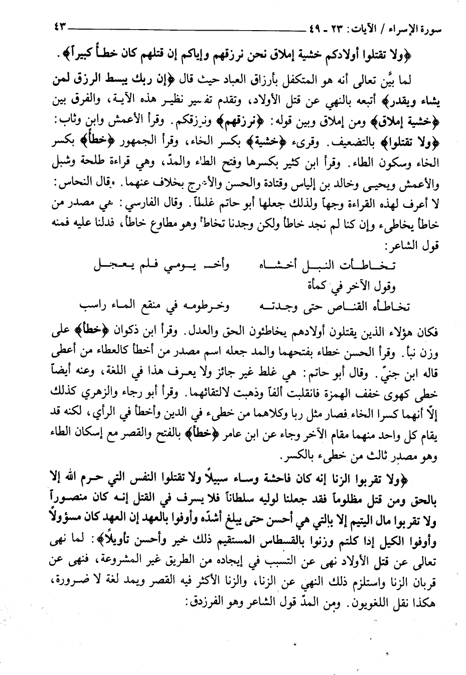 وَلا تَقْرَبُوا الزِّنى إِنَّهُ كانَ فاحِشَةً وَساءَ سَبِيلًا وَلا تَقْتُلُوا النَّفْسَ الَّتِي حَرَّمَ اللَّهُ إِلَّا بِالْحَقِّ وَمَنْ قُتِلَ مَظْلُوماً فَقَدْ جَعَلْنا لِوَلِيِّهِ سُلْطاناً فَلا يُسْرِفْ فِي الْقَتْلِ إِنَّهُ كانَ مَنْصُوراً وَلا تَقْرَبُوا مالَ الْيَتِيمِ إِلَّا بِالَّتِي هِيَ أَحْسَنُ حَتَّى يَبْلُغَ أَشُدَّهُ وَأَوْفُوا بِالْعَهْدِ إِنَّ الْعَهْدَ كانَ مَسْؤُلًا وَأَوْفُوا الْكَيْلَ إِذا كِلْتُمْ وَزِنُوا بِالْقِسْطاسِ الْمُسْتَقِيمِ ذلِكَ خَيْرٌ وَأَحْسَنُ تَأْوِيلًا: لَمَّا نَهَى تَعَالَى عَنْ قَتْلِ الْأَوْلَادِ نَهَى عَنِ التَّسَبُّبِ فِي إِيجَادِهِ مِنَ الطَّرِيقِ غَيْرِ الْمَشْرُوعَةِ، فَنَهَى عَنْ قُرْبَانِ الزِّنَا وَاسْتَلْزَمَ ذَلِكَ النَّهْيَ عَنِ الزِّنَا، وَالزِّنَا الْأَكْثَرُ فِيهِ الْقَصْرُ وَيُمَدُّ لُغَةً لَا ضَرُورَةً، هَكَذَا نَقَلَ اللُّغَوِيُّونَ. وَمِنَ الْمَدِّ قَوْلُ الشَّاعِرِ وَهُوَ الْفَرَزْدَقُ: