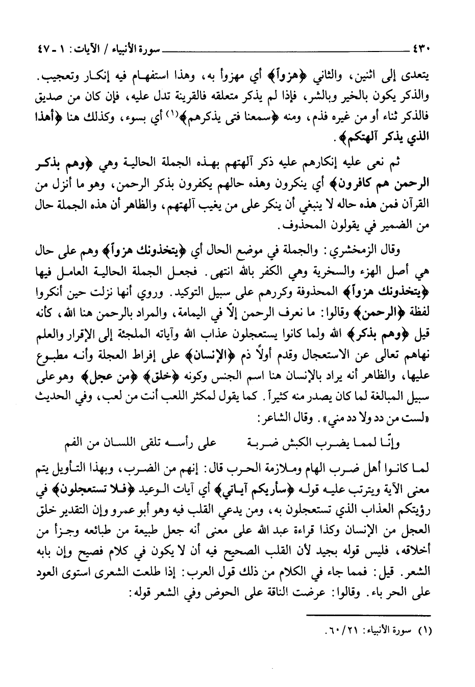 وَقَالَ الزَّمَخْشَرِيُّ: وَالْجُمْلَةُ فِي مَوْضِعِ الْحَالِ أَيْ يَتَّخِذُونَكَ هُزُوًا وَهُمْ عَلَى حَالٍ هِيَ أَصْلُ الْهُزْءِ وَالسُّخْرِيَةِ وَهِيَ الْكُفْرُ بِاللَّهِ انْتَهَى. فَجَعَلَ الْجُمْلَةَ الْحَالِيَّةَ الْعَامِلَ فِيهَا يَتَّخِذُونَكَ هُزُوًا الْمَحْذُوفَةَ وَكَرَّرَهُمْ عَلَى سَبِيلِ التَّوْكِيدِ. وَرُوِيَ أَنَّهَا نَزَلَتْ حِينَ أَنْكَرُوا لَفْظَةَ الرَّحْمنِ وَقَالُوا: مَا نَعْرِفُ الرَّحْمَنَ إِلَّا فِي الْيَمَامَةِ، وَالْمُرَادُ بِالرَّحْمَنِ هُنَا اللَّهُ، كَأَنَّهُ قِيلَ وَهُمْ بِذِكْرِ اللَّهِ وَلَمَّا كَانُوا يَسْتَعْجِلُونَ عَذَابَ اللَّهِ وَآيَاتِهِ الْمُلْجِئَةَ إِلَى الْإِقْرَارِ وَالْعِلْمِ نَهَاهُمْ تَعَالَى عَنِ الِاسْتِعْجَالِ وَقَدَّمَ أَوَّلًا ذَمَّ الْإِنْسانُ عَلَى إِفْرَاطِ الْعَجَلَةِ وَأَنَّهُ مَطْبُوعٌ عَلَيْهَا، وَالظَّاهِرُ أَنَّهُ يُرَادُ بِالْإِنْسَانِ هُنَا اسْمُ الْجِنْسِ وَكَوْنُهُ خُلِقَ مِنْ عَجَلٍ وَهُوَ عَلَى سَبِيلِ الْمُبَالَغَةِ لَمَّا كَانَ يَصْدُرُ مِنْهُ كَثِيرًا. كَمَا يَقُولُ لِمُكْثِرِ اللَّعِبِ أَنْتَ مِنْ لَعِبٍ،