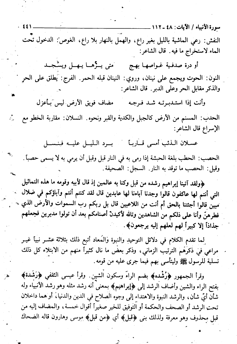 وَقَرَأَ الْجُمْهُورُ رُشْدَهُ بِضَمِّ الرَّاءِ وَسُكُونِ الشِّينِ. وَقَرَأَ عِيسَى الثَّقَفِي رُشْدَهُ بِفَتْحِ الرَّاءِ وَالشِّينِ وَأَضَافَ الرُّشْدَ إِلَى إِبْراهِيمَ بِمَعْنَى أَنَّهُ رُشْدُ مِثْلِهِ وَهُوَ رُشْدُ الْأَنْبِيَاءِ وَلَهُ شَأْنٌ أَيُّ شَأْنٍ، وَالرُّشْدُ النُّبُوَّةُ وَالِاهْتِدَاءُ إِلَى وُجُوهِ الصَّلَاحِ فِي الدِّينِ وَالدُّنْيَا، أَوْ هُمَا دَاخِلَانِ تَحْتَ الرُّشْدِ أَوِ الصُّحُفِ وَالْحِكْمَةِ أَوِ التَّوْفِيقِ لِلْخَيْرِ صَغِيرًا أَقْوَالٌ خَمْسَةٌ، وَالْمُضَافُ إِلَيْهِ مِنْ قِبَلِ مَحْذُوفٍ وَهُوَ مَعْرِفَةٌ وَلِذَلِكَ بَنَى قَبْلُ أَيْ مِنْ قَبْلُ مُوسَى وَهَارُونُ قَالَهُ الضَّحَّاكُ