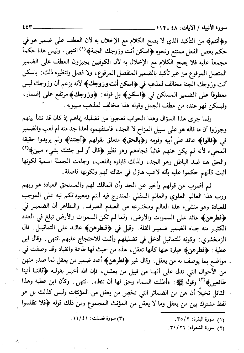ثُمَّ أَضْرَبَ عَنْ قَوْلِهِمْ وَأَخْبَرَ عَنِ الْجِدِّ وَأَنَّ الْمَالِكَ لَهُمْ وَالْمُسْتَحِقَّ الْعِبَادَةَ هُوَ رَبُّهُمْ وَرَبُّ هَذَا الْعَالَمِ الْعُلْوِيِّ وَالْعَالَمِ السُّفْلِيِّ الْمُنْدَرِجِ فِيهِ أَنْتُمْ وَمَعْبُودَاتُكُمْ نَبَّهَ عَلَى الْمُوجِبِ للعبادة وهو منشىء هَذَا الْعَالَمِ وَمُخْتَرِعُهُ مِنَ الْعَدَمِ الصِّرْفِ. وَالظَّاهِرُ أَنَّ الضَّمِيرَ فِي فَطَرَهُنَّ عَائِدٌ على السموات وَالْأَرْضِ، وَلَمَّا لَمْ تَكُنِ السموات وَالْأَرْضُ تَبْلُغُ فِي الْعَدَدِ الْكَثِيرِ مِنْهُ جَاءَ الضَّمِيرُ ضَمِيرَ الْقِلَّةِ. وَقِيلَ فِي فَطَرَهُنَّ عَائِدٌ عَلَى التَّمَاثِيلِ. قَالَ الزَّمَخْشَرِيُّ: وَكَوْنُهُ لِلتَّمَاثِيلِ أَدْخَلَ فِي تَضْلِيلِهِمْ وَأَثْبَتَ لِلِاحْتِجَاجِ عَلَيْهِمْ انْتَهَى. وَقَالَ ابْنُ عَطِيَّةَ: فَطَرَهُنَّ عِبَارَةٌ عَنْهَا كَأَنَّهَا تَعْقِلُ، هَذِهِ مِنْ حَيْثُ لَهَا طَاعَةٌ وَانْقِيَادٌ وَقَدْ وُصِفَتْ فِي مَوَاضِعَ بِمَا يُوصَفُ بِهِ مَنْ يَعْقِلُ. وَقَالَ غَيْرُ فَطَرَهُنَّ أَعَادَ ضَمِيرَ مَنْ يَعْقِلُ لِمَا صَدَرَ مِنْهُنَّ مِنَ الْأَحْوَالِ الَّتِي تَدُلُّ عَلَى أَنَّهَا مِنْ قَبِيلِ مَنْ يَعْقِلُ، فَإِنَّ اللَّهَ أَخْبَرَ بِقَوْلِهِ قالَتا أَتَيْنا طائِعِينَ «3»