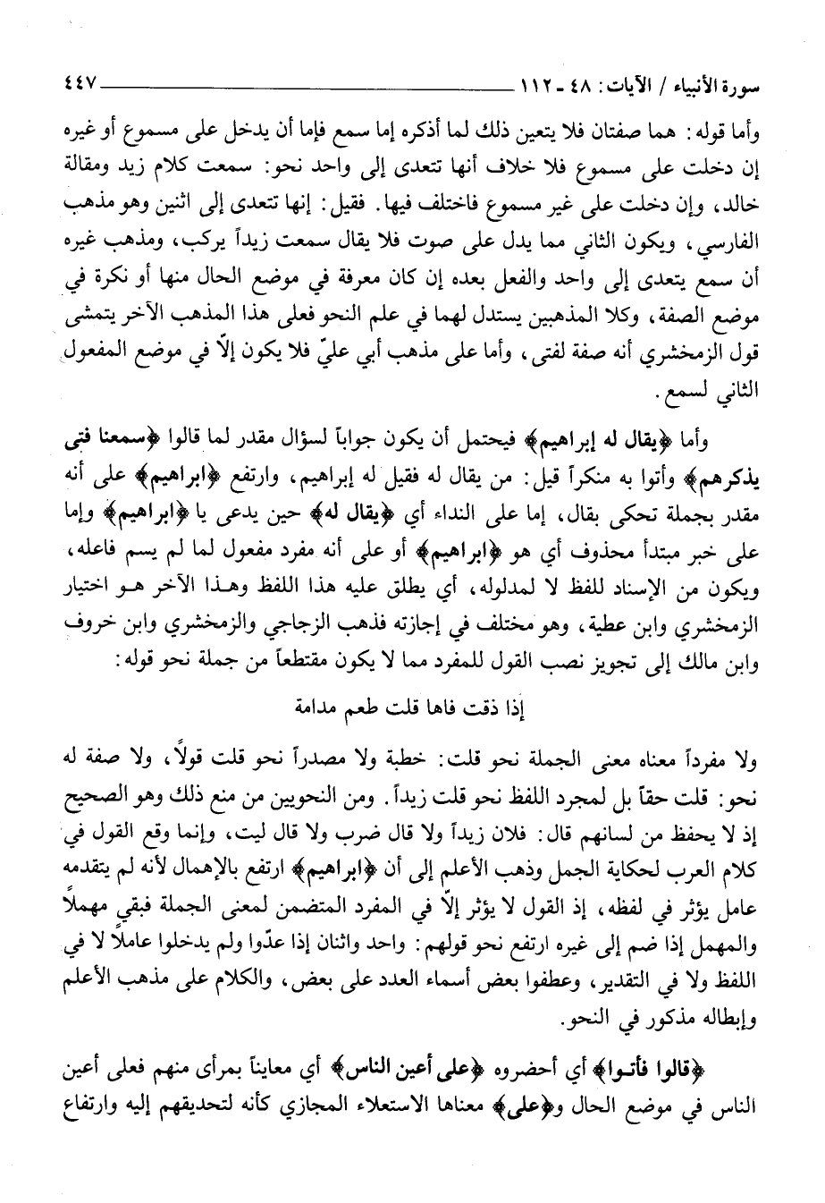 إِذَا ذُقْتُ فَاهًا قُلْتُ طَعْمُ مُدَامَةٍ وَلَا مُفْرَدًا مَعْنَاهُ مَعْنَى الْجُمْلَةِ نَحْوَ قُلْتُ: خُطْبَةً وَلَا مَصْدَرًا نَحْوَ قُلْتُ قَوْلًا، وَلَا صِفَةً لَهُ نَحْوَ: قُلْتُ حَقًّا بَلْ لِمُجَرَّدِ اللَّفْظِ نَحْوَ قُلْتُ زَيْدًا. وَمِنَ النَّحْوِيِّينَ مَنْ مَنَعَ ذَلِكَ وَهُوَ الصَّحِيحُ إِذْ لَا يُحْفَظُ مِنْ لِسَانِهِمْ قَالَ: فُلَانٌ زَيْدًا وَلَا قَالَ ضَرَبَ وَلَا قَالَ لَيْتَ، وَإِنَّمَا وَقَعَ الْقَوْلُ فِي كَلَامِ الْعَرَبِ لِحِكَايَةِ الْجُمَلِ وَذَهَبَ الْأَعْلَمُ إِلَى أَنَّ إِبْراهِيمُ ارْتَفَعَ بِالْإِهْمَالِ لِأَنَّهُ لَمْ يَتَقَدَّمْهُ عَامِلٌ يُؤَثِّرُ فِي لَفْظِهِ، إِذِ الْقَوْلُ لَا يُؤَثِّرُ إِلَّا فِي الْمُفْرَدِ الْمُتَضَمِّنِ لِمَعْنَى الْجُمْلَةِ فَبَقِيَ مُهْمَلًا وَالْمُهْمَلُ إِذَا ضُمَّ إِلَى غَيْرِهِ ارْتَفَعَ نَحْوَ قَوْلِهِمْ: وَاحِدٌ وَاثْنَانِ إِذَا عَدُّوا وَلَمْ يُدْخِلُوا عَامِلًا لَا فِي اللَّفْظِ وَلَا فِي التَّقْدِيرِ، وَعَطَفُوا بَعْضَ أَسْمَاءِ الْعَدَدِ عَلَى بَعْضٍ، وَالْكَلَامُ عَلَى مَذْهَبِ الْأَعْلَمِ وَإِبْطَالُهُ مَذْكُورٌ فِي النَّحْوِ.