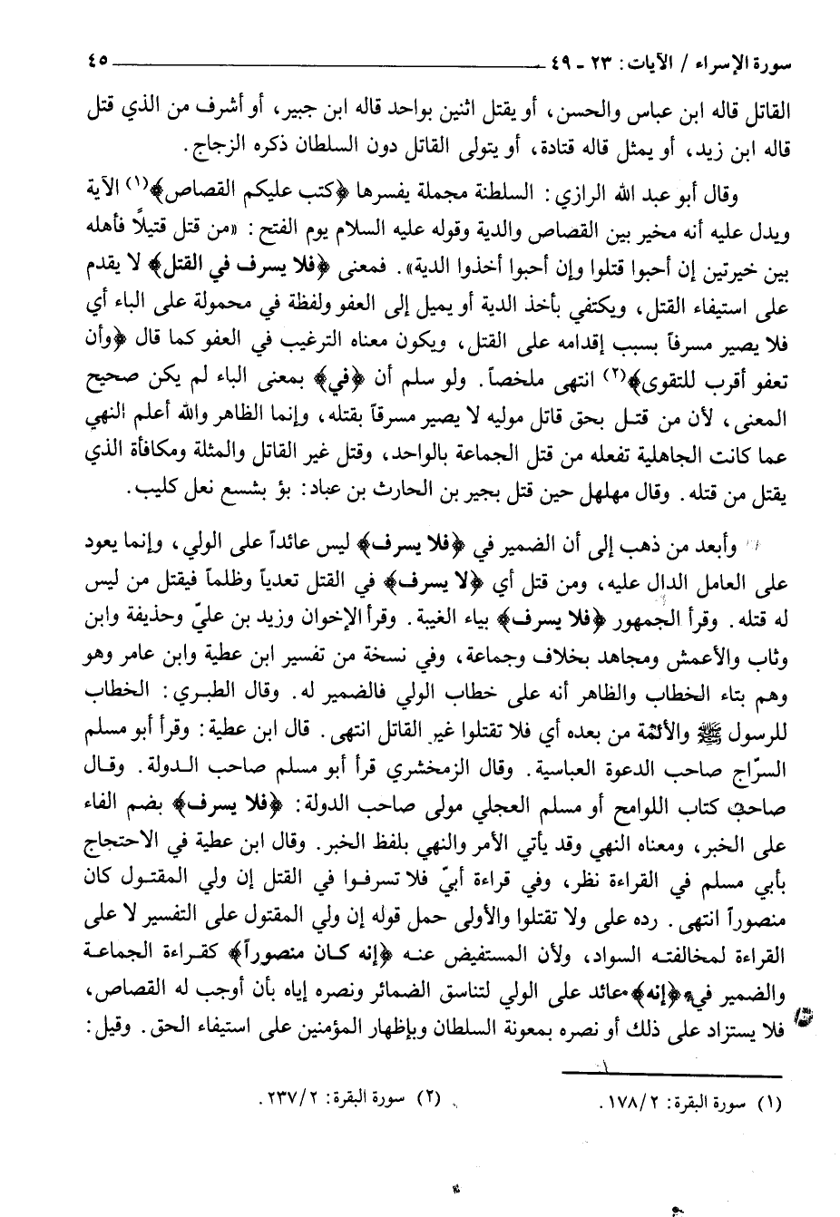 وَأَبْعَدُ مَنْ ذَهَبَ إِلَى أَنَّ الضَّمِيرَ فِي فَلا يُسْرِفْ لَيْسَ عَائِدًا عَلَى الْوَلِيِّ، وَإِنَّمَا يَعُودُ عَلَى الْعَامِلِ الدَّالِّ عَلَيْهِ، وَمَنْ قُتِلَ أَيْ لَا يُسْرِفْ فِي الْقَتْلِ تَعَدِّيًا وَظُلْمًا فَيَقْتُلُ مَنْ لَيْسَ لَهُ قَتْلُهُ. وَقَرَأَ الْجُمْهُورُ فَلا يُسْرِفْ بِيَاءِ الْغَيْبَةِ. وَقَرَأَ الْأَخَوَانِ وَزَيْدُ بْنُ عَلِيٍّ وَحُذَيْفَةُ وَابْنُ وَثَّابٍ وَالْأَعْمَشُ وَمُجَاهِدٌ بِخِلَافٍ وَجَمَاعَةٍ، وَفِي نُسْخَةٍ مِنْ تَفْسِيرِ ابْنِ عَطِيَّةَ وَابْنِ عَامِرٍ وَهُوَ وَهْمٌ بِتَاءِ الْخِطَابِ وَالظَّاهِرُ أَنَّهُ عَلَى خِطَابِ الْوَلِيِّ فَالضَّمِيرُ لَهُ. وَقَالَ الطَّبَرِيُّ: الْخِطَابُ لِلرَّسُولِ صَلَّى اللَّهُ عَلَيْهِ وَسَلَّمَ وَالْأَئِمَّةِ مِنْ بَعْدِهِ أَيْ فَلَا تَقْتُلُوا غَيْرَ الْقَاتِلِ انْتَهَى. قَالَ ابْنُ عَطِيَّةَ: وَقَرَأَ أَبُو مُسْلِمٍ السَّرَّاجُ صَاحِبُ الدَّعْوَةِ الْعَبَّاسِيَّةِ. وَقَالَ الزَّمَخْشَرِيُّ قَرَأَ أَبُو مُسْلِمٍ صَاحِبُ الدَّوْلَةِ. وَقَالَ صَاحِبُ كِتَابِ اللَّوَامِحِ أَوْ مُسْلِمٌ الْعِجْلِيُّ مَوْلَى صَاحِبِ الدَّوْلَةِ: فَلا يُسْرِفْ بِضَمِّ الْفَاءِ عَلَى الْخَبَرِ، وَمَعْنَاهُ النَّهْيُ وَقَدْ يَأْتِي الْأَمْرُ وَالنَّهْيُ بِلَفْظِ الْخَبَرِ. وَقَالَ ابْنُ عَطِيَّةَ فِي الِاحْتِجَاجِ بِأَبِي مُسْلِمٍ فِي الْقِرَاءَةِ نَظَرٌ، وَفِي قِرَاءَةِ أُبَيٍّ فَلَا تُسْرِفُوا فِي الْقَتْلِ إِنَّ وَلِيَّ الْمَقْتُولِ كَانَ مَنْصُورًا انْتَهَى. رَدَّهُ عَلَى وَلَا تَقْتُلُوا وَالْأَوْلَى حَمْلُ قَوْلِهِ إِنَّ وَلِيَّ الْمَقْتُولِ عَلَى التَّفْسِيرِ لَا عَلَى الْقِرَاءَةِ لِمُخَالَفَتِهِ السَّوَادَ، وَلِأَنَّ الْمُسْتَفِيضَ عَنْهُ إِنَّهُ كانَ مَنْصُوراً كَقِرَاءَةِ الْجَمَاعَةِ وَالضَّمِيرُ فِي إِنَّهُ عَائِدٌ عَلَى الْوَلِيِّ لِتَنَاسُقِ الضَّمَائِرِ وَنَصْرُهُ إِيَّاهُ بِأَنْ أَوْجَبَ لَهُ الْقِصَاصَ، فَلَا يُسْتَزَادُ عَلَى ذَلِكَ أَوْ نَصْرُهُ بِمَعُونَةِ السُّلْطَانِ وَبِإِظْهَارِ الْمُؤْمِنِينَ عَلَى اسْتِيفَاءِ الْحَقِّ. وَقِيلَ:
