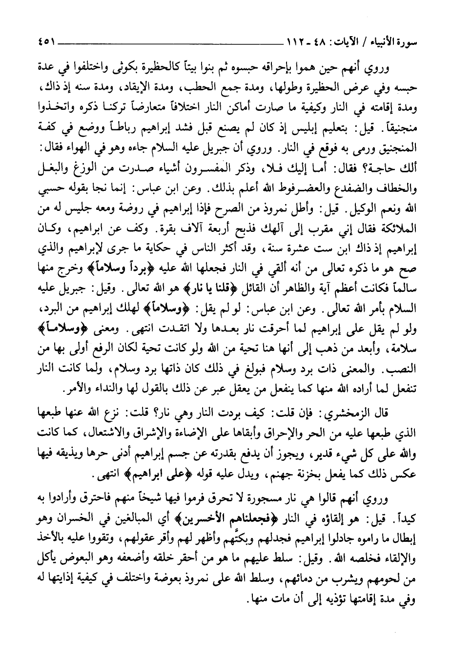 قَالَ الزَّمَخْشَرِيُّ: فَإِنْ قُلْتَ: كيف بَرُدَتِ النَّارُ وَهِيَ نَارٌ؟ قُلْتُ: نَزَعَ اللَّهُ عَنْهَا طَبْعَهَا الَّذِي طَبَعَهَا عَلَيْهِ مِنَ الْحَرِّ وَالْإِحْرَاقِ وَأَبْقَاهَا عَلَى الْإِضَاءَةِ وَالْإِشْرَاقِ وَالِاشْتِعَالِ، كَمَا كَانَتْ وَاللَّهُ عَلَى كُلِّ شَيْءٍ قَدِيرٌ، وَيَجُوزُ أَنْ يَدْفَعَ بِقُدْرَتِهِ عَنْ جِسْمِ إِبْرَاهِيمَ أَدْنَى حَرِّهَا وَيُذِيقَهُ فِيهَا عَكْسَ ذَلِكَ كَمَا يَفْعَلُ بِخَزَنَةِ جَهَنَّمَ، وَيَدُلُّ عَلَيْهِ قَوْلُهُ عَلى إِبْراهِيمَ انْتَهَى.
