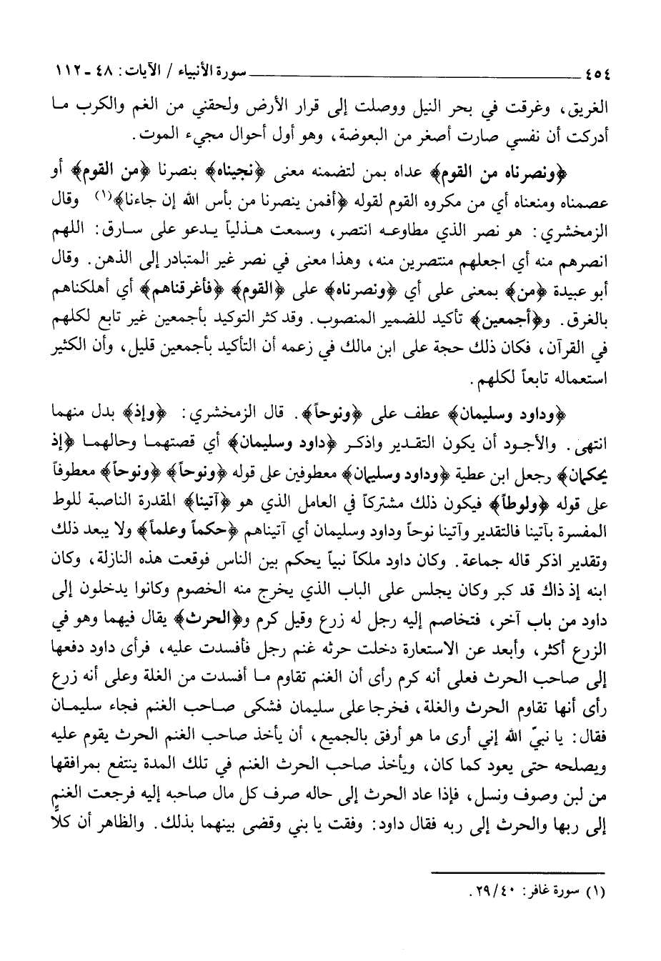 وَداوُدَ وَسُلَيْمانَ عَطْفٌ عَلَى وَنُوحاً. قَالَ الزَّمَخْشَرِيُّ: وإِذْ بَدَلٌ مِنْهُمَا انْتَهَى. وَالْأَجْوَدُ أَنْ يَكُونَ التَّقْدِيرُ وَاذْكُرْ داوُدَ وَسُلَيْمانَ أَيْ قِصَّتَهُمَا وَحَالَهُمَا إِذْ يَحْكُمانِ وَجَعَلَ ابْنُ عَطِيَّةَ وَداوُدَ وَسُلَيْمانَ مَعْطُوفَيْنِ عَلَى قوله وَنُوحاً وَنُوحاً مَعْطُوفًا عَلَى قَوْلِهِ وَلُوطاً فَيَكُونُ ذَلِكَ مُشْتَرِكًا فِي الْعَامِلِ الَّذِي هُوَ آتَيْنا الْمُقَدَّرَةُ النَّاصِبَةُ لِلُوطٍ الْمُفَسَّرَةُ بِآتَيْنَا فَالتَّقْدِيرُ وَآتَيْنَا نُوحًا وَدَاوُدَ وَسُلَيْمَانَ أَيْ آتَيْنَاهُمْ حُكْماً وَعِلْماً وَلَا يَبْعُدُ ذَلِكَ وَتَقْدِيرُ اذْكُرْ قَالَهُ جَمَاعَةٌ. وَكَانَ دَاوُدُ مَلِكًا نَبِيًّا يَحْكُمُ بَيْنَ النَّاسِ فَوَقَعَتْ هَذِهِ النَّازِلَةُ، وَكَانَ ابْنُهُ إِذْ ذَاكَ قَدْ كَبُرَ وَكَانَ يَجْلِسُ عَلَى الْبَابِ الَّذِي يَخْرُجُ مِنْهُ الْخُصُومُ وَكَانُوا يَدْخُلُونَ إِلَى دَاوُدَ مِنْ بَابٍ آخَرَ، فَتَخَاصَمَ إِلَيْهِ رَجُلٌ لَهُ زَرْعٌ وَقِيلَ كَرْمٌ والْحَرْثِ يُقَالُ فِيهِمَا وَهُوَ فِي الزَّرْعِ أَكْثَرُ، وَأَبْعَدُ عَنِ الِاسْتِعَارَةِ دَخَلَتْ حَرْثَهُ غَنَمُ رَجُلٍ فَأَفْسَدَتْ عَلَيْهِ،