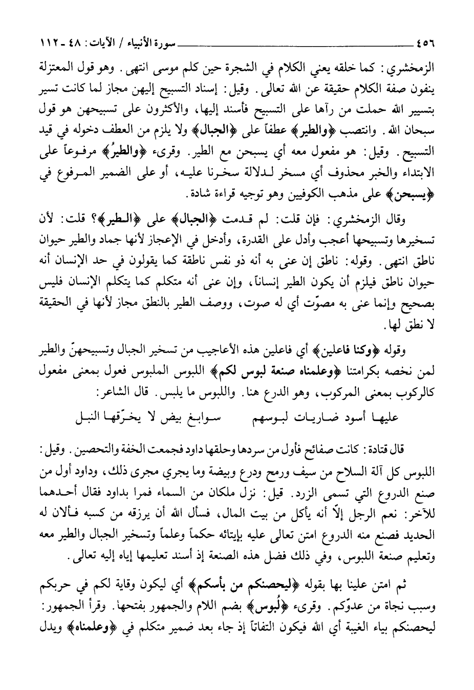 الزَّمَخْشَرِيُّ: كَمَا خَلَقَهُ يَعْنِي الْكَلَامَ فِي الشَّجَرَةِ حِينَ كَلَّمَ مُوسَى انْتَهَى. وَهُوَ قَوْلُ الْمُعْتَزِلَةِ يَنْفُونَ صِفَةَ الْكَلَامِ حَقِيقَةً عَنِ اللَّهِ تَعَالَى. وَقِيلَ: إِسْنَادُ التَّسْبِيحِ إِلَيْهِنَّ مَجَازٌ لَمَّا كَانَتْ تَسِيرُ بِتَسْيِيرِ اللَّهِ حَمَلَتْ مَنْ رَآهَا عَلَى التَّسْبِيحِ فَأُسْنِدَ إِلَيْهَا، وَالْأَكْثَرُونَ عَلَى تَسْبِيحِهِنَّ هُوَ قَوْلُ سُبْحَانَ اللَّهِ. وَانْتَصَبَ وَالطَّيْرَ عَطْفًا عَلَى الْجِبالَ وَلَا يَلْزَمُ مِنَ الْعَطْفِ دُخُولُهُ فِي قَيْدِ التَّسْبِيحِ. وَقِيلَ: هُوَ مَفْعُولٌ مَعَهُ أَيْ يُسَبِّحْنَ مع الطير. وقرىء وَالطَّيْرَ مَرْفُوعًا عَلَى الِابْتِدَاءِ وَالْخَبَرُ مَحْذُوفٌ أَيْ مُسَخَّرٌ لِدَلَالَةِ سَخَّرْنَا عَلَيْهِ، أَوْ عَلَى الضَّمِيرِ الْمَرْفُوعِ فِي يُسَبِّحْنَ عَلَى مَذْهَبِ الْكُوفِيِّينَ وَهُوَ توجيه قراءة شادة.