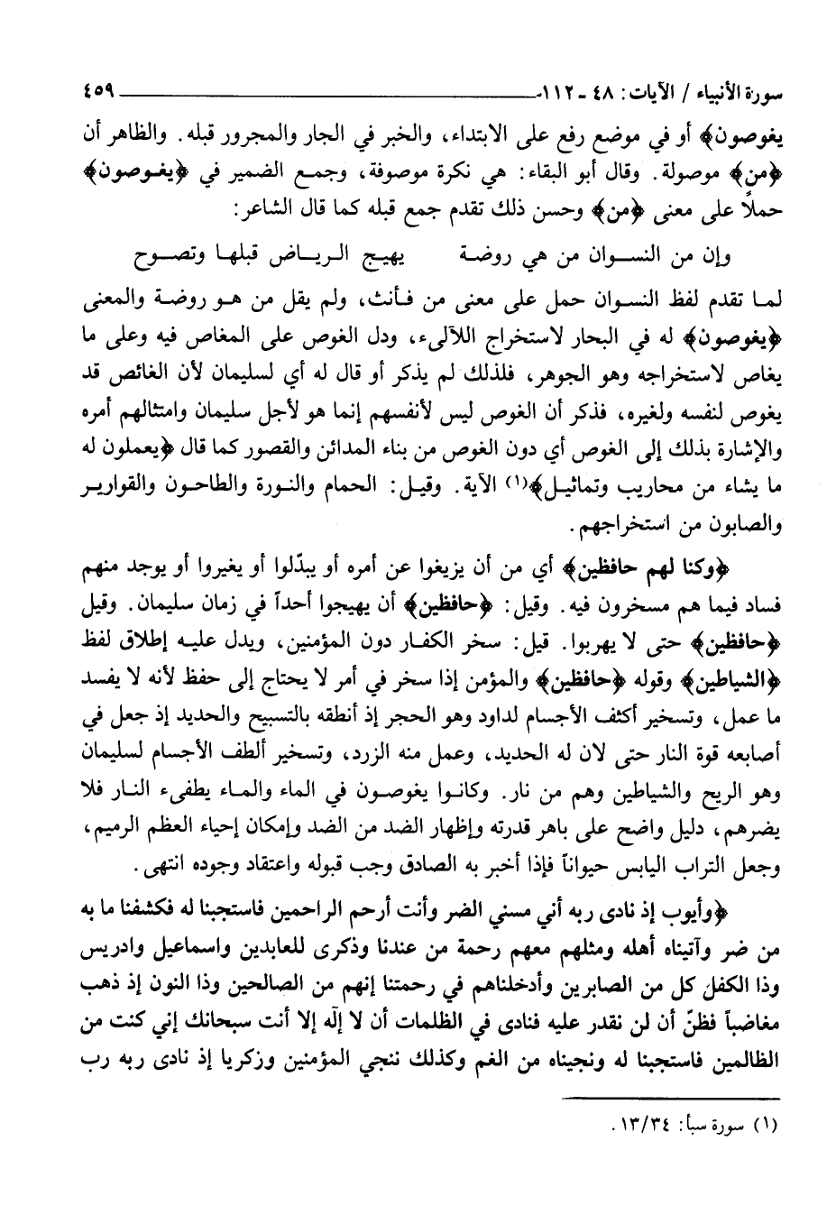 وَكُنَّا لَهُمْ حافِظِينَ أَيْ مِنْ أَنْ يَزِيغُوا عَنْ أَمْرِهِ أَوْ يُبَدِّلُوا أَوْ يُغَيِّرُوا أَوْ يُوجَدَ مِنْهُمْ فَسَادٌ فِيمَا هُمْ مُسَخَّرُونَ فِيهِ. وَقِيلَ: حافِظِينَ أَنْ يُهَيِّجُوا أَحَدًا فِي زَمَانِ سُلَيْمَانَ. وَقِيلَ حافِظِينَ حَتَّى لَا يَهْرُبُوا. قيل: سخر الكفار دون المؤمنين، ويدل عليه إطلاق لفظ الشَّياطِينِ وقوله حافِظِينَ والمؤمن إذا سَخَّرَ فِي أَمْرٍ لَا يَحْتَاجُ إِلَى حِفْظٍ لِأَنَّهُ لَا يُفْسِدُ مَا عَمِلَ، وَتَسْخِيرُ أَكْثَفِ الْأَجْسَامِ لِدَاوُدَ وَهُوَ الْحَجَرُ إِذْ أَنْطَقَهُ بِالتَّسْبِيحِ وَالْحَدِيدُ إِذْ جَعَلَ فِي أَصَابِعِهِ قُوَّةَ النَّارِ حَتَّى لَانَ لَهُ الْحَدِيدُ، وَعَمِلَ مِنْهُ الزَّرَدَ، وَتَسْخِيرُ أَلْطَفِ الْأَجْسَامِ لِسُلَيْمَانَ وَهُوَ الرِّيحُ وَالشَّيَاطِينُ وَهُمْ مِنْ نَارٍ. وَكَانُوا يَغُوصُونَ فِي الماء والماء يطفىء النَّارَ فَلَا يَضُرُّهُمْ، دَلِيلٌ وَاضِحٌ عَلَى بَاهِرِ قُدْرَتِهِ وَإِظْهَارِ الضِّدِّ مِنَ الضِّدِّ وَإِمْكَانِ إِحْيَاءِ الْعَظْمِ الرَّمِيمِ، وَجَعْلِ التُّرَابِ الْيَابِسِ حَيَوَانًا فَإِذَا أَخْبَرَ بِهِ الصَّادِقُ وَجَبَ قَبُولُهُ وَاعْتِقَادُ وُجُودِهِ انْتَهَى.