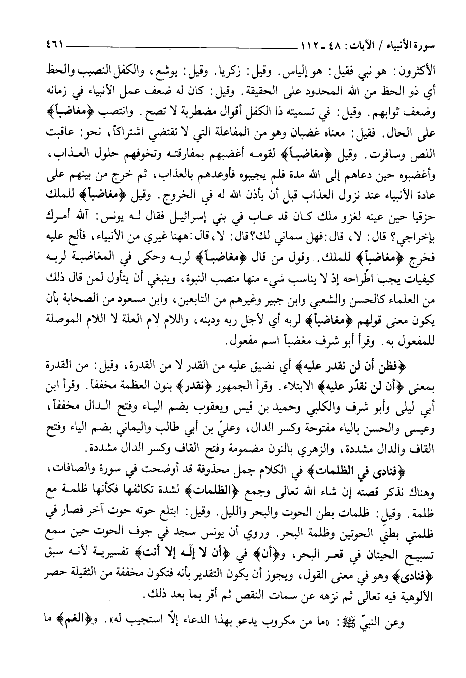 وَقَوْلُ مَنْ قَالَ مُغاضِباً لِرَبِّهِ وَحَكَى فِي الْمُغَاضَبَةِ لِرَبِّهِ كَيْفِيَّاتٍ يَجِبُ اطِّرَاحَهُ إِذْ لَا يُنَاسِبُ شَيْءٌ مِنْهَا مَنْصِبَ النُّبُوَّةِ، وَيَنْبَغِي أَنْ يَتَأَوَّلَ لِمَنْ قَالَ ذَلِكَ مِنَ الْعُلَمَاءِ كَالْحَسَنِ وَالشَّعْبِيِّ وَابْنِ جُبَيْرٍ وَغَيْرِهِمْ مِنَ التَّابِعِينَ، وَابْنِ مَسْعُودٍ مِنَ الصَّحَابَةِ بِأَنْ يَكُونَ مَعْنَى قَوْلِهِمْ مُغاضِباً لِرَبِّهِ أَيْ لِأَجْلِ رَبِّهِ وَدِينِهِ، وَاللَّامُ لَامُ الْعِلَّةِ لَا اللَّامُ الْمُوَصِّلَةُ لِلْمَفْعُولِ بِهِ. وَقَرَأَ أَبُو شَرَفٍ مُغْضِبًا اسْمَ مَفْعُولٍ.
