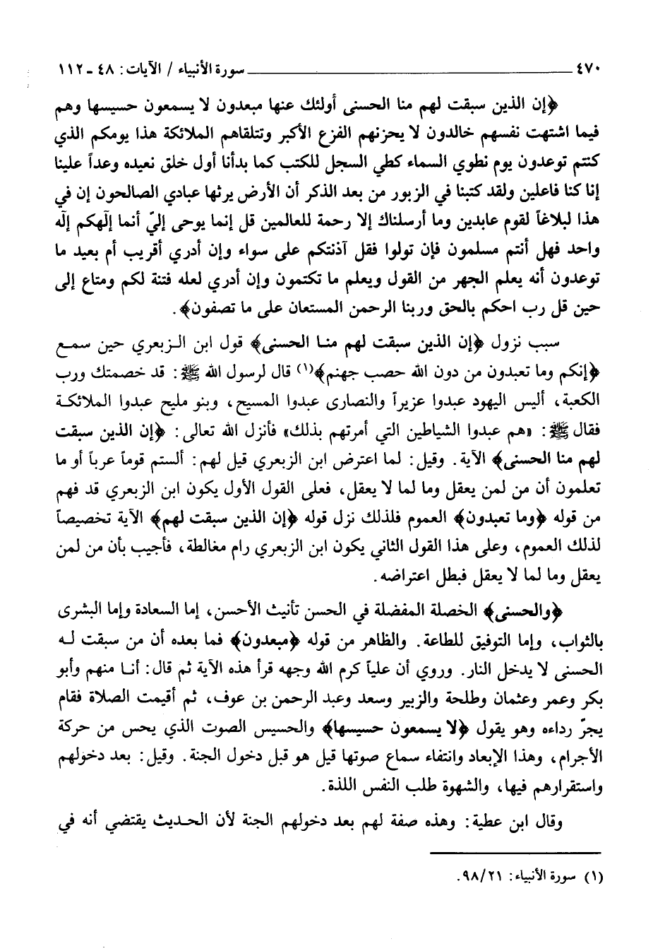 سَبَبُ نُزُولِ إِنَّ الَّذِينَ سَبَقَتْ لَهُمْ مِنَّا الْحُسْنى قَوْلُ ابْنِ الزِّبَعْرَى حِينَ سَمِعَ إِنَّكُمْ وَما تَعْبُدُونَ مِنْ دُونِ اللَّهِ حَصَبُ جَهَنَّمَ «1» قَالَ لِرَسُولِ اللَّهِ صَلَّى اللَّهُ عَلَيْهِ وَسَلَّمَ: قَدْ خَصِمْتُكَ وَرَبِّ الْكَعْبَةِ، أَلَيْسَ الْيَهُودُ عَبَدُوا عُزَيْرًا وَالنَّصَارَى عَبَدُوا الْمَسِيحَ، وَبَنُو مَلِيحٍ عَبَدُوا الْمَلَائِكَةَ فَقَالَ صَلَّى اللَّهُ عَلَيْهِ وَسَلَّمَ: «هُمْ عَبَدُوا الشَّيَاطِينَ الَّتِي أَمَرَتْهُمْ بِذَلِكَ» فَأَنْزَلَ اللَّهُ تَعَالَى: إِنَّ الَّذِينَ سَبَقَتْ لَهُمْ مِنَّا الْحُسْنى
