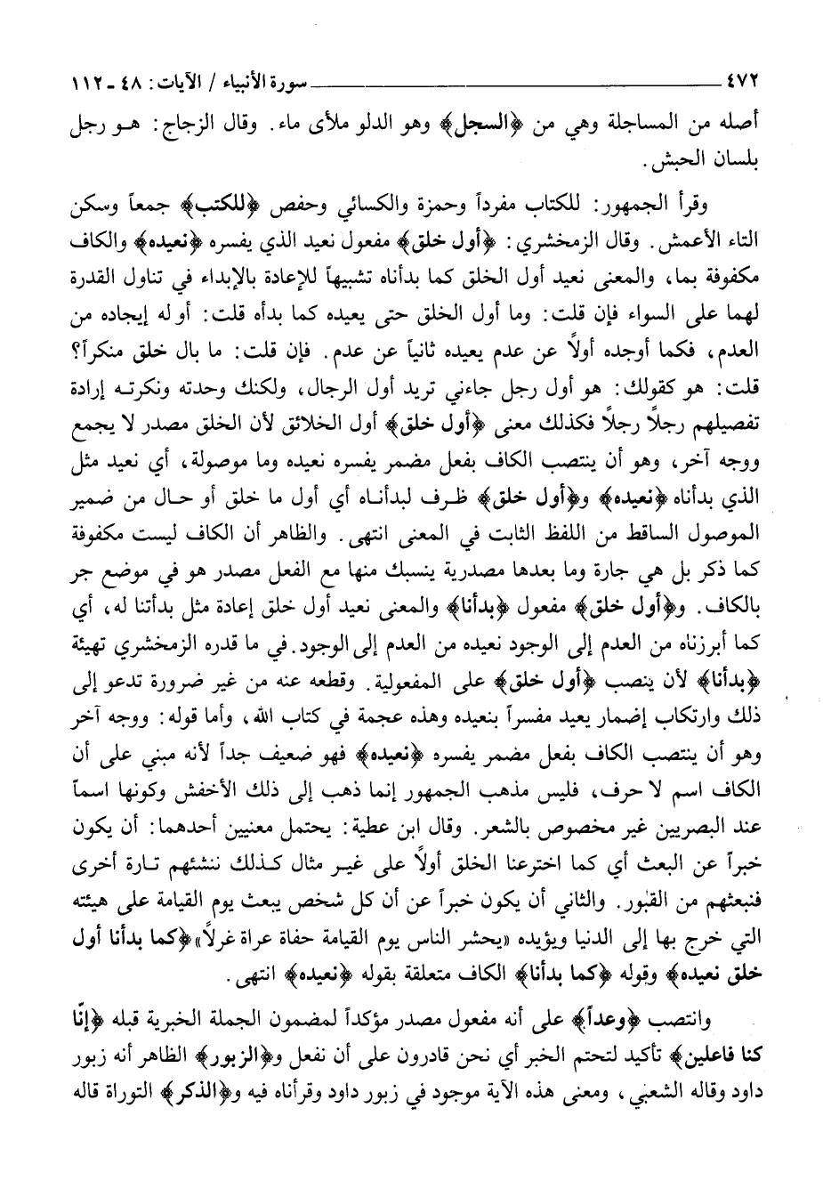 وَقَرَأَ الْجُمْهُورُ: لِلْكِتَابِ مُفْرَدًا وَحَمْزَةُ وَالْكِسَائِيُّ وَحَفْصٌ لِلْكُتُبِ جَمْعًا وَسَكَّنَ التَّاءَ الْأَعْمَشُ. وَقَالَ الزَّمَخْشَرِيُّ: أَوَّلَ خَلْقٍ مَفْعُولُ نُعِيدُ الَّذِي يُفَسِّرُهُ نُعِيدُهُ وَالْكَافُ مَكْفُوفَةٌ بِمَا، وَالْمَعْنَى نُعِيدُ أَوَّلَ الْخَلْقِ كَمَا بَدَأْنَاهُ تَشْبِيهًا لِلْإِعَادَةِ بِالْإِبْدَاءِ فِي تَنَاوُلِ الْقُدْرَةِ لَهُمَا عَلَى السَّوَاءِ فَإِنْ قُلْتَ: وَمَا أَوَّلُ الْخَلْقِ حَتَّى يُعِيدَهُ كَمَا بَدَأَهُ قُلْتُ: أَوَّلُهُ إِيجَادُهُ مِنَ الْعَدَمِ، فَكَمَا أَوْجَدَهُ أَوَّلًا عَنْ عَدَمٍ يُعِيدُهُ ثَانِيًا عَنْ عَدَمٍ. فَإِنْ قُلْتَ: مَا بَالُ خَلْقٍ مُنْكِرًا؟