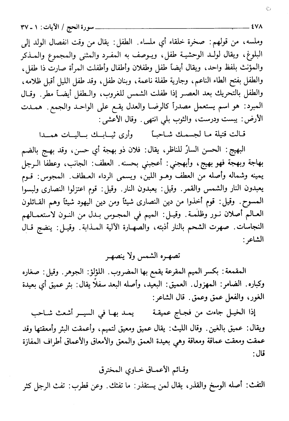 الْبَهِيجُ: الْحَسَنُ السَّارُّ لِلنَّاظِرِ، يُقَالُ: فُلَانٌ ذُو بَهْجَةٍ أَيْ حُسْنٍ، وَقَدْ بَهُجَ بِالضَّمِّ بَهَاجَةً وَبَهْجَةً فَهُوَ بَهِيجٌ، وَأَبْهَجَنِي: أَعْجَبَنِي بِحُسْنِهِ. الْعَطْفُ: الْجَانِبُ، وَعِطْفَا الرَّجُلِ يَمِينُهُ وَشِمَالُهُ وَأَصْلُهُ مِنَ الْعَطْفِ وَهُوَ اللِّينُ، وَيُسَمَّى الرِّدَاءُ الْعِطَافَ. الْمَجُوسُ: قَوْمٌ يَعْبُدُونَ النَّارَ وَالشَّمْسَ وَالْقَمَرَ. وَقِيلَ: يَعْبُدُونَ النَّارَ. وَقِيلَ: قَوْمٌ اعْتَزَلُوا النَّصَارَى وَلَبِسُوا الْمُسُوحَ. وَقِيلَ: قَوْمٌ أَخَذُوا مِنْ دِينِ النَّصَارَى شَيْئًا وَمِنْ دِينِ الْيَهُودِ شَيْئًا وَهُمُ الْقَائِلُونَ الْعَالَمُ أَصْلَانِ نُورٌ وَظُلْمَةٌ. وَقِيلَ: الْمِيمُ فِي الْمَجُوسِ بَدَلٌ مِنَ النُّونِ لِاسْتِعْمَالِهِمُ النَّجَاسَاتِ. صَهَرْتُ الشَّحْمَ بِالنَّارِ أَذَبْتُهُ، وَالصُّهَارَةُ الْإِلْيَةُ الْمُذَابَةُ. وَقِيلَ: يَنْضَجُ قَالَ الشَّاعِرُ: