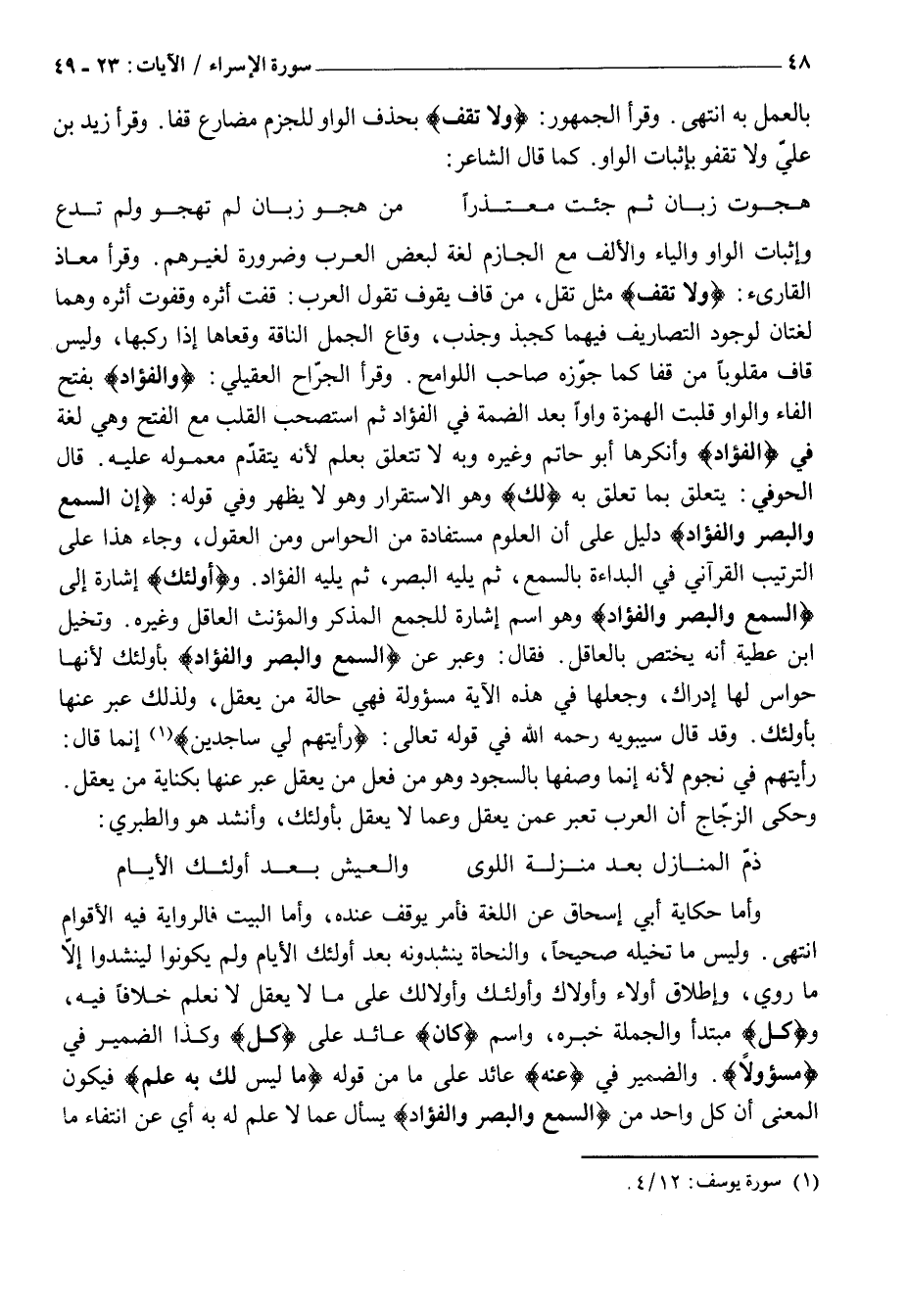 وَإِثْبَاتُ الْوَاوِ وَالْيَاءِ وَالْأَلِفِ مَعَ الْجَازِمِ لُغَةٌ لِبَعْضِ الْعَرَبِ وَضَرُورَةٌ لِغَيْرِهِمْ. وَقَرَأَ مُعَاذٌ الْقَارِئُ: وَلا تَقْفُ مِثْلَ تَقُلْ، مِنْ قَافَ يَقُوفُ تَقُولُ الْعَرَبُ: قُفْتُ أَثَرَهُ وَقَفَوْتُ أَثَرَهُ وَهُمَا لُغَتَانِ لِوُجُودِ التَّصَارِيفِ فِيهِمَا كَجَبَذَ وَجَذَبَ، وَقَاعَ الْجَمَلُ النَّاقَةَ وَقَعَاهَا إِذَا رَكِبَهَا، وَلَيْسَ قَافَ مَقْلُوبًا مِنْ قَفَا كَمَا جَوَّزَهُ صَاحِبُ اللَّوَامِحِ. وَقَرَأَ الْجَرَّاحُ الْعُقَيْلِيُّ: وَالْفُؤادَ بِفَتْحِ الْفَاءِ وَالْوَاوِ قُلِبَتِ الْهَمْزَةُ وَاوًا بَعْدَ الضَّمَّةِ فِي الْفُؤَادِ ثُمَّ اسْتُصْحِبَ الْقَلْبُ مَعَ الْفَتْحِ وَهِيَ لُغَةٌ فِي الْفُؤادَ وَأَنْكَرَهَا أَبُو حَاتِمٍ وَغَيْرُهُ وَبِهِ لَا تَتَعَلَّقُ بِعَلَمٍ لِأَنَّهُ يَتَقَدَّمُ مَعْمُولُهُ عَلَيْهِ. قَالَ الْحَوْفِيُّ: يَتَعَلَّقُ بِمَا تَعَلَّقَ بِهِ لَكَ وَهُوَ الِاسْتِقْرَارُ وَهُوَ لَا يَظْهَرُ وَفِي قَوْلِهِ: إِنَّ السَّمْعَ وَالْبَصَرَ وَالْفُؤادَ دَلِيلٌ عَلَى أَنَّ الْعُلُومَ مُسْتَفَادَةٌ مِنَ الْحَوَاسِّ وَمِنَ الْعُقُولِ، وَجَاءَ هَذَا عَلَى التَّرْتِيبِ الْقُرْآنِيِّ فِي الْبَدَاءَةِ بِالسَّمْعِ، ثُمَّ يَلِيهِ الْبَصَرُ، ثُمَّ يَلِيهِ الْفُؤَادُ. وأُولئِكَ إِشَارَةٌ إِلَى السَّمْعَ وَالْبَصَرَ وَالْفُؤادَ وَهُوَ اسْمُ إِشَارَةٍ لِلْجَمْعِ الْمُذَكَّرِ وَالْمُؤَنَّثِ الْعَاقِلِ وَغَيْرِهِ. وَتَخَيَّلَ ابْنُ عَطِيَّةَ أَنَّهُ يَخْتَصُّ بِالْعَاقِلِ. فَقَالَ: وَعَبَّرَ عَنِ السَّمْعَ وَالْبَصَرَ وَالْفُؤادَ بِأُولَئِكَ لِأَنَّهَا حَوَاسٌّ لَهَا إِدْرَاكٌ، وَجَعَلَهَا فِي هذه الآية مسؤولة فَهِيَ حَالَةُ مَنْ يَعْقِلُ، وَلِذَلِكَ عَبَّرَ عَنْهَا بِأُولَئِكَ. وَقَدْ قَالَ سِيبَوَيْهِ رَحِمَهُ اللَّهُ في قوله تعالى: رَأَيْتُهُمْ لِي ساجِدِينَ «1» إِنَّمَا قَالَ: