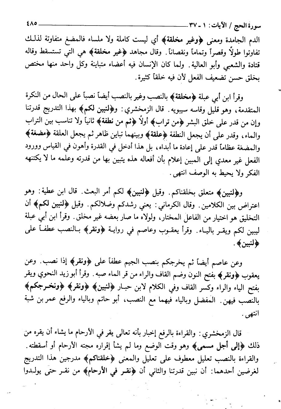 وَقَرَأَ ابْنُ أَبِي عَبْلَةَ مُخَلَّقَةٍ بِالنَّصْبِ وَغَيْرَ بِالنَّصْبِ أَيْضًا نَصْبًا عَلَى الْحَالِ مِنَ النَّكِرَةِ الْمُتَقَدِّمَةِ، وَهُوَ قَلِيلٌ وَقَاسَهُ سِيبَوَيْهِ. قَالَ الزمخشري: ولِنُبَيِّنَ لَكُمْ بِهَذَا التَّدْرِيجِ قُدْرَتُنَا وَإِنَّ مَنْ قَدَرَ عَلَى خَلْقِ الْبَشَرِ مِنْ تُرابٍ أَوَّلًا ثُمَّ مِنْ نُطْفَةٍ ثَانِيًا وَلَا تَنَاسُبَ بَيْنَ التُّرَابِ وَالْمَاءِ، وَقَدَرَ عَلَى أَنْ يَجْعَلَ النُّطْفَةَ عَلَقَةٍ وَبَيْنَهُمَا تَبَايُنٌ ظَاهِرٌ ثُمَّ يَجْعَلَ الْعَلَقَةَ مُضْغَةٍ وَالْمُضْغَةَ عِظَامًا قَدَرَ عَلَى إِعَادَةِ مَا أَبْدَاهُ، بَلْ هَذَا أَدْخَلُ فِي الْقُدْرَةِ وَأَهْوَنُ فِي الْقِيَاسِ وَوُرُودُ الْفِعْلِ غَيْرَ مُعَدًّى إِلَى الْمُبَيَّنِ إِعْلَامٌ بِأَنَّ أَفْعَالَهُ هَذِهِ يَتَبَيَّنُ بِهَا مِنْ قُدْرَتِهِ وَعِلْمِهِ مَا لَا يَكْتَنِهُهُ الْفِكْرُ وَلَا يُحِيطُ بِهِ الْوَصْفُ انتهى.