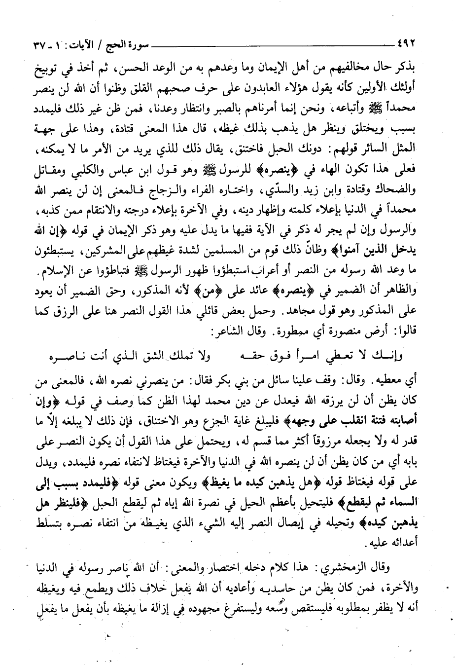 أَيْ مُعْطِيهِ. وَقَالَ: وَقَفَ عَلَيْنَا سَائِلٌ مِنْ بَنِي بَكْرٍ فَقَالَ: مَنْ يَنْصُرُنِي نَصَرَهُ اللَّهُ، فَالْمَعْنَى مَنْ كَانَ يَظُنُّ أَنْ لَنْ يَرْزُقَهُ اللَّهُ فَيَعْدِلُ عَنْ دِينِ مُحَمَّدٍ لِهَذَا الظَّنِّ كَمَا وَصَفَ فِي قَوْلِهِ وَإِنْ أَصابَتْهُ فِتْنَةٌ انْقَلَبَ عَلى وَجْهِهِ فَلْيَبْلُغْ غَايَةَ الْجَزَعِ وَهُوَ الِاخْتِنَاقُ، فَإِنَّ ذَلِكَ لَا يَبْلُغُهُ إِلَّا مَا قُدِّرَ لَهُ وَلَا يَجْعَلُهُ مَرْزُوقًا أَكْثَرَ مِمَّا قُسِمَ لَهُ، وَيُحْتَمَلُ عَلَى هَذَا الْقَوْلِ أَنْ يَكُونَ النَّصْرُ عَلَى بَابِهِ أَيْ من كان يظن أن لَنْ يَنْصُرَهُ اللَّهُ فِي الدُّنْيَا وَالْآخِرَةِ فَيَغْتَاظُ لِانْتِفَاءِ نَصْرِهِ فَلْيَمْدُدْ، وَيَدُلُّ عَلَى قَوْلِهِ فَيَغْتَاظُ قَوْلُهُ هَلْ يُذْهِبَنَّ كَيْدُهُ مَا يَغِيظُ وَيَكُونُ مَعْنَى قَوْلِهِ فَلْيَمْدُدْ بِسَبَبٍ إِلَى السَّماءِ ثُمَّ لْيَقْطَعْ فَلْيَتَحَيَّلْ بِأَعْظَمِ الْحِيَلِ فِي نُصْرَةِ اللَّهِ إِيَّاهُ ثُمَّ لْيَقْطَعِ الْحَبْلَ فَلْيَنْظُرْ هَلْ يُذْهِبَنَّ كَيْدُهُ وَتَحَيُّلُهُ فِي إِيصَالِ النَّصْرِ إِلَيْهِ الشَّيْءَ الَّذِي يَغِيظُهُ مِنِ انْتِفَاءِ نَصْرِهِ بِتَسَلُّطِ أَعْدَائِهِ عَلَيْهِ.