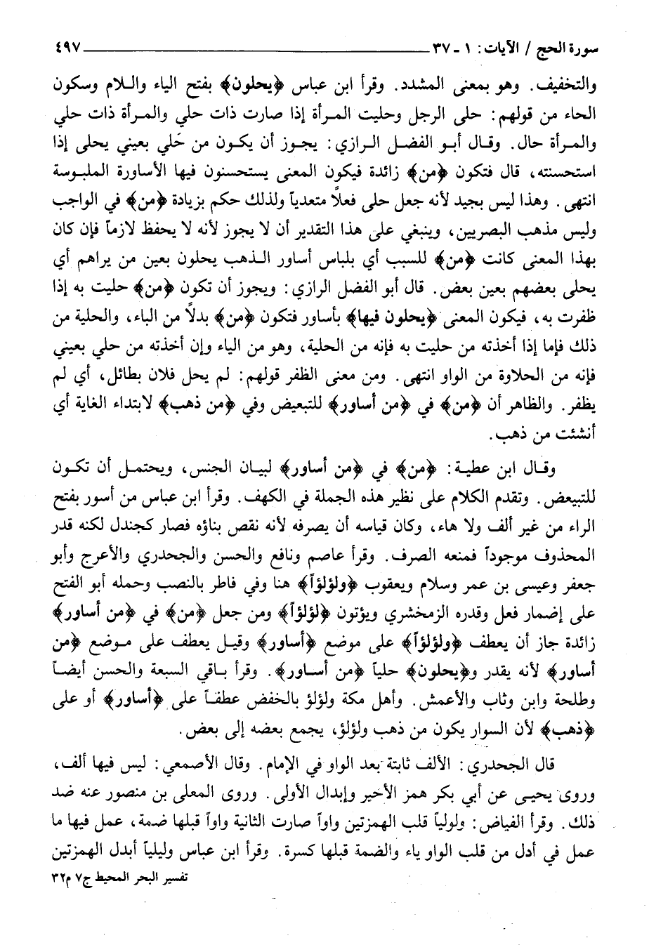 وَقَالَ ابْنُ عَطِيَّةَ: مِنْ فِي مِنْ أَساوِرَ لِبَيَانِ الْجِنْسِ، وَيُحْتَمَلُ أَنْ تَكُونَ لِلتَّبْعِيضِ. وَتَقَدَّمَ الْكَلَامُ عَلَى نَظِيرِ هَذِهِ الْجُمْلَةِ فِي الْكَهْفِ. وَقَرَأَ ابْنُ عَبَّاسٍ مِنْ أَسْوَرَ بِفَتْحِ الرَّاءِ مِنْ غَيْرِ أَلِفٍ وَلَا هَاءٍ، وَكَانَ قِيَاسَهُ أَنْ يَصْرِفَهُ لِأَنَّهُ نَقَصَ بِنَاؤُهُ فَصَارَ كَجَنْدَلٍ لَكِنَّهُ قَدَّرَ الْمَحْذُوفَ مَوْجُودًا فَمَنَعَهُ الصَّرْفَ. وَقَرَأَ عَاصِمٌ وَنَافِعٌ وَالْحَسَنُ وَالْجَحْدَرِيُّ وَالْأَعْرَجُ وَأَبُو جَعْفَرٍ وَعِيسَى بْنُ عُمَرَ وَسَلَامٌ وَيَعْقُوبُ وَلُؤْلُؤاً هُنَا وَفِي فَاطِرٍ بِالنَّصْبِ وَحَمَلَهُ أَبُو الْفَتْحِ عَلَى إِضْمَارِ فِعْلٍ وَقَدَّرَهُ الزَّمَخْشَرِيُّ وَيُؤْتَوْنَ لُؤْلُؤاً وَمَنْ جَعَلَ مِنْ فِي مِنْ أَساوِرَ زَائِدَةً جَازَ أَنْ يَعْطِفَ وَلُؤْلُؤاً عَلَى مَوْضِعِ أَساوِرَ وَقِيلَ يُعْطَفُ عَلَى مَوْضِعِ مِنْ أَساوِرَ لِأَنَّهُ يُقَدَّرُ ويُحَلَّوْنَ حُلِيًّا مِنْ أَساوِرَ. وَقَرَأَ بَاقِي السَّبْعَةِ وَالْحَسَنُ أَيْضًا وَطَلْحَةُ وَابْنُ وَثَّابٍ وَالْأَعْمَشُ. وَأَهْلُ مَكَّةَ وَلُؤْلُؤٌ بِالْخَفْضِ عَطْفًا عَلَى أَساوِرَ أَوْ عَلَى ذَهَبٍ لِأَنَّ السِّوَارَ يَكُونُ مِنْ ذَهَبٍ وَلُؤْلُؤٍ، يُجْمَعُ بَعْضُهُ إِلَى بَعْضٍ.
