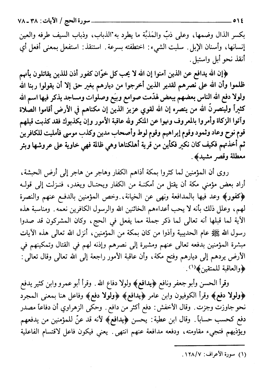 إِنَّ اللَّهَ يُدافِعُ عَنِ الَّذِينَ آمَنُوا إِنَّ اللَّهَ لَا يُحِبُّ كُلَّ خَوَّانٍ كَفُورٍ أُذِنَ لِلَّذِينَ يُقاتَلُونَ بِأَنَّهُمْ ظُلِمُوا وَإِنَّ اللَّهَ عَلى نَصْرِهِمْ لَقَدِيرٌ الَّذِينَ أُخْرِجُوا مِنْ دِيارِهِمْ بِغَيْرِ حَقٍّ إِلَّا أَنْ يَقُولُوا رَبُّنَا اللَّهُ وَلَوْلا دَفْعُ اللَّهِ النَّاسَ بَعْضَهُمْ بِبَعْضٍ لَهُدِّمَتْ صَوامِعُ وَبِيَعٌ وَصَلَواتٌ وَمَساجِدُ يُذْكَرُ فِيهَا اسْمُ اللَّهِ كَثِيراً وَلَيَنْصُرَنَّ اللَّهُ مَنْ يَنْصُرُهُ إِنَّ اللَّهَ لَقَوِيٌّ عَزِيزٌ الَّذِينَ إِنْ مَكَّنَّاهُمْ فِي الْأَرْضِ أَقامُوا الصَّلاةَ وَآتَوُا الزَّكاةَ وَأَمَرُوا بِالْمَعْرُوفِ وَنَهَوْا عَنِ الْمُنْكَرِ وَلِلَّهِ عاقِبَةُ الْأُمُورِ وَإِنْ يُكَذِّبُوكَ فَقَدْ كَذَّبَتْ قَبْلَهُمْ قَوْمُ نُوحٍ وَعادٌ وَثَمُودُ وَقَوْمُ إِبْراهِيمَ وَقَوْمُ لُوطٍ وَأَصْحابُ مَدْيَنَ وَكُذِّبَ مُوسى فَأَمْلَيْتُ لِلْكافِرِينَ ثُمَّ أَخَذْتُهُمْ فَكَيْفَ كانَ نَكِيرِ فَكَأَيِّنْ مِنْ قَرْيَةٍ أَهْلَكْناها وَهِيَ ظالِمَةٌ فَهِيَ خاوِيَةٌ عَلى عُرُوشِها وَبِئْرٍ مُعَطَّلَةٍ وَقَصْرٍ مَشِيدٍ.