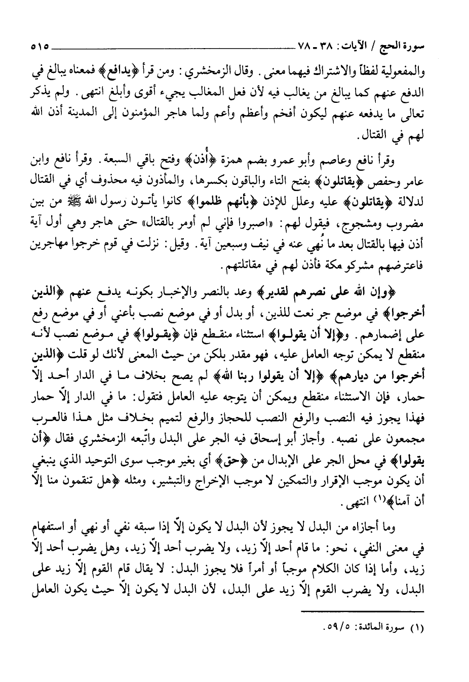 وَإِنَّ اللَّهَ عَلى نَصْرِهِمْ لَقَدِيرٌ وَعْدٌ بِالنَّصْرِ وَالْإِخْبَارِ بِكَوْنِهِ يَدْفَعُ عَنْهُمْ الَّذِينَ أُخْرِجُوا فِي مَوْضِعِ جَرٍّ نَعْتٌ لِلَّذِينَ، أَوْ بَدَلٌ أَوْ فِي مَوْضِعِ نَصْبٍ بِأَعْنِي أَوْ فِي مَوْضِعِ رَفْعٍ عَلَى إضمارهم. وإِلَّا أَنْ يَقُولُوا اسْتِثْنَاءٌ مُنْقَطِعٌ فَإِنَّ يَقُولُوا فِي مَوْضِعِ نَصْبٍ لِأَنَّهُ مُنْقَطِعٌ لَا يُمْكِنُ تَوَجُّهُ الْعَامِلِ عَلَيْهِ، فَهُوَ مُقَدَّرٌ بِلَكِنَّ مِنْ حَيْثُ الْمَعْنَى لِأَنَّكَ لَوْ قُلْتَ الَّذِينَ أُخْرِجُوا مِنْ دِيارِهِمْ إِلَّا أَنْ يَقُولُوا رَبُّنَا اللَّهُ لَمْ يَصِحَّ بِخِلَافِ مَا فِي الدَّارِ أَحَدٌ إِلَّا حِمَارٌ، فَإِنَّ الِاسْتِثْنَاءَ مُنْقَطِعٌ وَيُمْكِنُ أَنْ يَتَوَجَّهَ عَلَيْهِ الْعَامِلُ فَتَقُولُ: مَا فِي الدَّارِ إِلَّا حِمَارٌ فَهَذَا يَجُوزُ فِيهِ النَّصْبُ وَالرَّفْعُ النَّصْبُ لِلْحِجَازِ وَالرَّفْعُ لِتَمِيمٍ بِخِلَافِ مِثْلِ هَذَا فَالْعَرَبُ مُجْمِعُونَ عَلَى نَصْبِهِ. وَأَجَازَ أَبُو إِسْحَاقَ فِيهِ الْجَرَّ عَلَى الْبَدَلِ وَاتَّبَعَهُ الزَّمَخْشَرِيُّ فَقَالَ أَنْ يَقُولُوا فِي مَحَلِّ الْجَرِّ عَلَى الْإِبْدَالِ مِنْ حَقٍّ أَيْ بِغَيْرِ مُوجِبٍ سِوَى التَّوْحِيدِ الَّذِي يَنْبَغِي أَنْ يَكُونَ مُوجَبَ الْإِقْرَارِ وَالتَّمْكِينِ لَا مُوجَبَ الْإِخْرَاجِ وَالتَّبْشِيرِ، وَمِثْلُهُ هَلْ تَنْقِمُونَ مِنَّا إِلَّا أَنْ آمَنَّا «1» انْتَهَى.