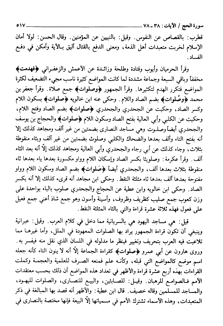 وَرَوَى هَارُونُ عَنْ أَبِي عمرو صَلَواتٌ كَقِرَاءَةِ الْجَمَاعَةِ إِلَّا أَنَّهُ لَا يُنَوِّنُ التَّاءَ كَأَنَّهُ جَعَلَهُ اسْمَ مَوْضِعٍ كَالْمَوَاضِعِ الَّتِي قَبْلَهُ، وَكَأَنَّهُ عَلَمٌ فَمَنَعَهُ الصَّرْفَ لِلْعَلَمِيَّةِ وَالْعُجْمَةِ وَكَمُلَتِ الْقِرَاءَاتُ بِهَذِهِ أَرْبَعَ عَشْرَةَ قِرَاءَةً وَالْأَظْهَرُ فِي تَعْدَادِ هَذِهِ الْمَوَاضِعِ أَنَّ ذَلِكَ بِحَسَبِ مُعْتَقَدَاتِ الْأُمَمِ فَالصَّوَامِعُ لِلرُّهْبَانِ. وَقِيلَ: لِلصَّابِئِينَ، وَالْبِيَعُ لِلنَّصَارَى، وَالصَّلَوَاتُ لِلْيَهُودِ، وَالْمَسَاجِدُ لِلْمُسْلِمِينَ وَقَالَهُ خُصَيْفٌ. قَالَ ابْنُ عَطِيَّةَ: وَالْأَظْهَرُ أَنَّهُ قَصَدَ بِهَا الْمُبَالَغَةَ فِي ذِكْرِ الْمُتَعَبَّدَاتِ، وَهَذِهِ الْأَسْمَاءُ تَشْتَرِكُ الْأُمَمُ فِي مُسَمَّيَاتِهَا إِلَّا الْبِيَعَةَ فَإِنَّهَا مُخْتَصَّةٌ بِالنَّصَارَى فِي