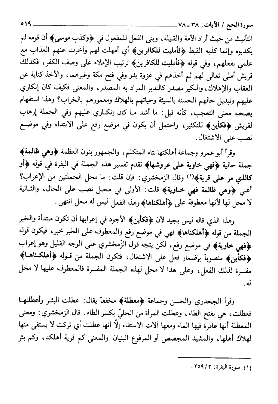 وَهَذَا الَّذِي قَالَهُ لَيْسَ بِجَيِّدٍ لِأَنَّ فَكَأَيِّنْ الْأَجْوَدُ فِي إِعْرَابِهَا أَنْ تَكُونَ مُبْتَدَأَةً وَالْخَبَرُ الْجُمْلَةُ مِنْ قَوْلِهِ أَهْلَكْناها فَهِيَ فِي مَوْضِعِ رَفْعٍ وَالْمَعْطُوفُ عَلَى الْخَبَرِ خَبَرٌ، فَيَكُونُ قَوْلُهُ فَهِيَ خاوِيَةٌ فِي مَوْضِعِ رَفْعٍ، لَكِنْ يَتَّجِهُ قَوْلُ الزَّمَخْشَرِيَّ عَلَى الْوَجْهِ الْقَلِيلِ وَهُوَ إِعْرَابُ فَكَأَيِّنْ مَنْصُوبًا بِإِضْمَارِ فِعْلٍ عَلَى الِاشْتِغَالِ، فَتَكُونُ الْجُمْلَةُ مِنْ قَوْلِهِ أَهْلَكْناها مُفَسِّرَةً لِذَلِكَ الْفِعْلِ، وَعَلَى هَذَا لَا مَحَلَّ لِهَذِهِ الْجُمْلَةِ الْمُفَسِّرَةِ فَالْمَعْطُوفُ عَلَيْهَا لَا مَحَلَّ لَهُ.