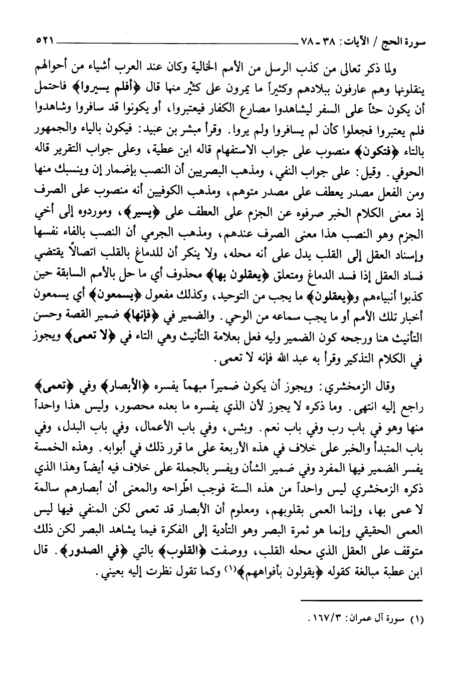 وَلَمَّا ذَكَرَ تَعَالَى مَنْ كَذَّبَ الرُّسُلَ مِنَ الْأُمَمِ الْخَالِيَةِ وَكَانَ عِنْدَ الْعَرَبِ أَشْيَاءُ مِنْ أَحْوَالِهِمْ يَنْقُلُونَهَا وَهُمْ عَارِفُونَ بِبِلَادِهِمْ وَكَثِيرًا مَا يَمُرُّونَ عَلَى كَثِيرٍ مِنْهَا قَالَ أَفَلَمْ يَسِيرُوا فَاحْتَمَلَ أَنْ يَكُونَ حَثًّا عَلَى السَّفَرِ لِيُشَاهِدُوا مَصَارِعَ الْكُفَّارِ فَيَعْتَبِرُوا، أَوْ يَكُونُوا قَدْ سَافَرُوا وَشَاهَدُوا فَلَمْ يَعْتَبِرُوا فَجُعِلُوا كَأَنْ لَمْ يُسَافِرُوا وَلَمْ يَرَوْا. وَقَرَأَ مُبَشِّرُ بْنُ عُبَيْدٍ: فَيَكُونُ بِالْيَاءِ وَالْجُمْهُورِ بِالتَّاءِ فَتَكُونَ مَنْصُوبٌ عَلَى جَوَابِ الِاسْتِفْهَامِ قَالَهُ ابْنُ عَطِيَّةَ، وَعَلَى جَوَابِ التَّقْرِيرِ قَالَهُ الْحَوْفِيُّ. وَقِيلَ: عَلَى جَوَابِ النَّفْيَ، وَمَذْهَبُ الْبَصْرِيِّينَ أَنَّ النَّصْبُ بِإِضْمَارِ أَنْ وَيَنْسَبِكُ مِنْهَا وَمِنَ الْفِعْلِ مَصْدَرٌ يُعْطَفُ عَلَى مَصْدَرٍ مُتَوَهَّمٍ، وَمَذْهَبُ الْكُوفِيِّينَ أَنَّهُ مَنْصُوبٌ عَلَى الصَّرْفِ إِذْ مَعْنَى الْكَلَامِ الْخَبَرُ صَرَفُوهُ عَنِ الْجَزْمِ على العطف على يَسِيرُوا، وموردوه إِلَى أَخِي الْجَزْمِ وَهُوَ النَّصْبُ هَذَا مَعْنَى الصَّرْفِ عِنْدَهُمْ، وَمَذْهَبُ الْجَرْمِيِّ أَنَّ النَّصْبَ بِالْفَاءِ نَفْسِهَا وَإِسْنَادُ الْعَقْلِ إِلَى الْقَلْبِ يَدُلُّ عَلَى أَنَّهُ مَحَلُّهُ، وَلَا يُنْكَرُ أَنَّ لِلدِّمَاغِ بِالْقَلْبِ اتِّصَالًا يَقْتَضِي فَسَادَ الْعَقْلِ إِذَا فَسَدَ الدِّمَاغُ وَمُتَعَلِّقُ يَعْقِلُونَ بِها مَحْذُوفٌ أَيْ مَا حَلَّ بِالْأُمَمِ السَّابِقَةِ حين كذبوا أنبياءهم ويَعْقِلُونَ مَا يَجِبُ مِنَ التَّوْحِيدِ، وَكَذَلِكَ مَفْعُولُ يَسْمَعُونَ أَيْ يَسْمَعُونَ أَخْبَارَ تِلْكَ الْأُمَمِ أَوْ مَا يَجِبُ سَمَاعُهُ مِنَ الْوَحْيِ. وَالضَّمِيرُ فِي فَإِنَّها ضَمِيرُ الْقِصَّةِ وَحَسُنَ التَّأْنِيثُ هُنَا وَرَجَّحَهُ كَوْنُ الضَّمِيرِ وَلِيَهُ فِعْلٌ بِعَلَامَةِ التَّأْنِيثِ وَهِيَ التَّاءُ فِي لَا تَعْمَى وَيَجُوزُ فِي الْكَلَامِ التَّذْكِيرُ وَقَرَأَ بِهِ عَبْدُ اللَّهِ فَإِنَّهُ لَا تَعْمَى.