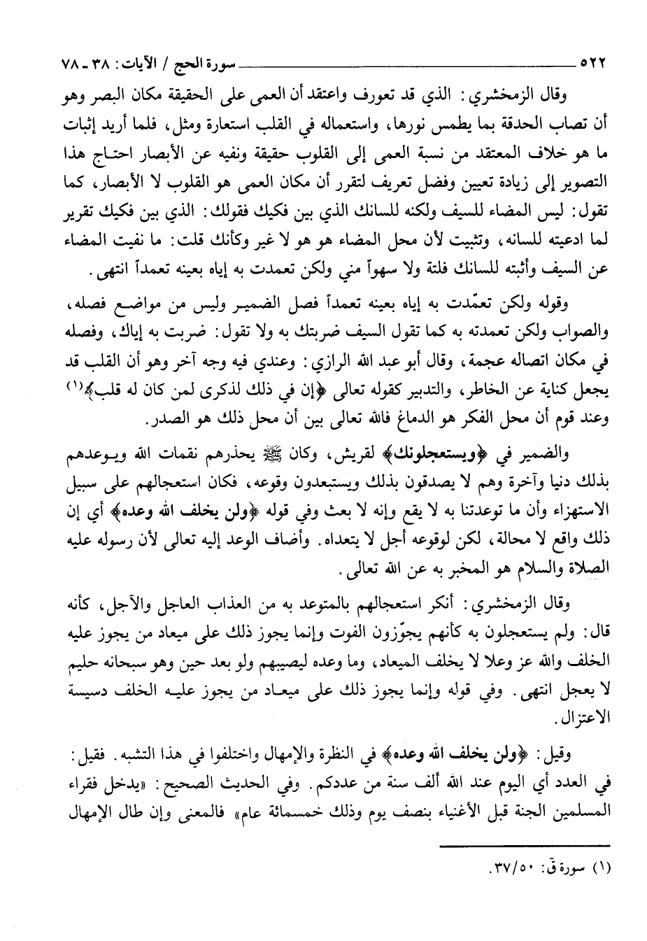 وَقَالَ الزَّمَخْشَرِيُّ: الَّذِي قَدْ تُعُورِفَ وَاعْتُقِدَ أَنَّ الْعَمَى عَلَى الْحَقِيقَةِ مَكَانُ الْبَصَرِ وَهُوَ أَنْ تُصَابَ الْحَدَقَةُ بِمَا يَطْمِسُ نُورَهَا، وَاسْتِعْمَالُهُ فِي الْقَلْبِ اسْتِعَارَةٌ وَمَثَلٌ، فلما أريد إِثْبَاتُ مَا هُوَ خِلَافُ الْمُعْتَقَدِ مِنْ نِسْبَةِ الْعَمَى إِلَى الْقُلُوبِ حَقِيقَةً وَنَفْيِهِ عَنِ الْأَبْصَارِ احْتَاجَ هَذَا التَّصْوِيرُ إِلَى زِيَادَةِ تَعْيِينٍ وَفَضْلِ تَعْرِيفٍ لِتَقَرُّرِ أَنَّ مَكَانَ الْعَمَى هُوَ الْقُلُوبُ لَا الْأَبْصَارُ، كَمَا تَقُولُ: لَيْسَ الْمَضَاءُ لِلسَّيْفِ وَلَكِنَّهُ لِلِسَانِكَ الَّذِي بَيْنَ فَكَّيْكَ فَقَوْلُكُ: الَّذِي بَيْنَ فَكَّيْكَ تَقْرِيرٌ لِمَا ادَّعَيْتَهُ لِلِسَانِهِ، وَتَثْبِيتٌ لِأَنَّ مَحَلَّ الْمَضَاءِ هُوَ هُوَ لَا غَيْرُ وَكَأَنَّكَ قُلْتَ: مَا نَفَيْتَ الْمَضَاءَ عَنِ السَّيْفِ وَأَثْبَتَّهُ لِلِسَانِكَ فَلْتَةً وَلَا سَهْوًا مِنِّي وَلَكِنْ تَعَمَّدْتُ بِهِ إِيَّاهُ بِعَيْنِهِ تَعَمُّدًا انْتَهَى.