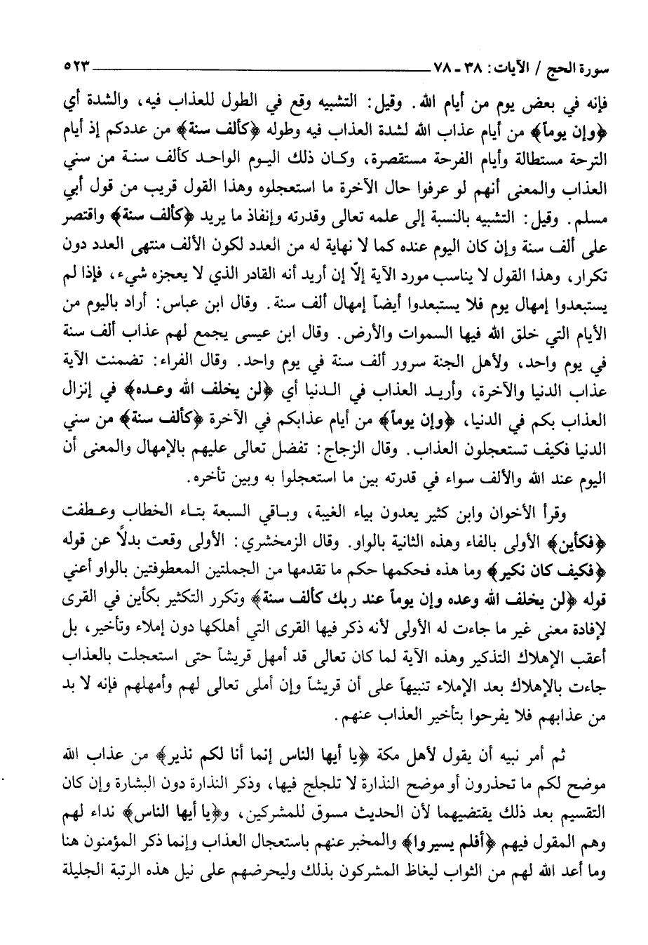 فَإِنَّهُ فِي بَعْضِ يَوْمٍ مِنْ أَيَّامِ اللَّهِ. وَقِيلَ: التَّشْبِيهُ وَقَعَ فِي الطُّولِ لِلْعَذَابِ فِيهِ، وَالشِّدَّةِ أَيْ وَإِنَّ يَوْماً مِنْ أَيَّامِ عَذَابِ اللَّهِ لِشِدَّةِ الْعَذَابِ فِيهِ وَطُولِهِ كَأَلْفِ سَنَةٍ مِنْ عَدَدِكُمْ إِذْ أَيَّامُ التَّرِحَةِ مُسْتَطَالَةٌ وَأَيَّامُ الْفَرْحَةِ مُسْتَقْصِرَةٌ، وَكَانَ ذَلِكَ الْيَوْمُ الْوَاحِدُ كَأَلْفِ سَنَةٍ مِنْ سِنِي الْعَذَابِ وَالْمَعْنَى أَنَّهُمْ لَوْ عَرَفُوا حَالَ الْآخِرَةِ مَا اسْتَعْجَلُوهُ وَهَذَا الْقَوْلُ قَرِيبٌ مِنْ قَوْلُ أَبِي مُسْلِمٍ. وَقِيلَ: التَّشْبِيهُ بِالنِّسْبَةِ إِلَى عِلْمِهِ تَعَالَى وَقُدْرَتِهِ وَإِنْفَاذِ مَا يُرِيدُ كَأَلْفِ سَنَةٍ وَاقْتَصَرَ عَلَى أَلْفِ سَنَةٍ وَإِنْ كَانَ الْيَوْمُ عِنْدَهُ كَمَا لَا نِهَايَةَ لَهُ مِنَ الْعَدَدِ لِكَوْنِ الْأَلْفِ مُنْتَهَى الْعَدَدِ دُونَ تَكْرَارٍ، وَهَذَا الْقَوْلُ لَا يُنَاسِبُ مَوْرِدَ الْآيَةِ إِلَّا إِنْ أُرِيدَ أَنَّهُ الْقَادِرُ الَّذِي لَا يُعْجِزُهُ شَيْءٌ، فَإِذَا لَمْ يَسْتَبْعِدُوا إِمْهَالَ يَوْمٍ فَلَا يَسْتَبْعِدُوا أَيْضًا إِمْهَالَ أَلْفِ سَنَةً. وَقَالَ ابْنُ عَبَّاسٍ: أَرَادَ بِالْيَوْمِ مِنَ الْأَيَّامِ الَّتِي خَلَقَ الله فيها السموات وَالْأَرْضَ. وَقَالَ ابْنُ عِيسَى يُجْمَعُ لَهُمْ عَذَابُ أَلْفِ سَنَةٍ فِي يَوْمٍ وَاحِدٍ، وَلِأَهْلِ الْجَنَّةِ سُرُورُ أَلْفِ سَنَةٍ فِي يَوْمٍ وَاحِدٍ. وَقَالَ الْفَرَّاءُ: تَضَمَّنَتِ الْآيَةُ عَذَابَ الدُّنْيَا وَالْآخِرَةِ، وَأُرِيدَ الْعَذَابُ فِي الدُّنْيَا أَيْ لَنْ يُخْلِفَ اللَّهُ وَعْدَهُ فِي إِنْزَالِ الْعَذَابِ بِكُمْ فِي الدُّنْيَا، وَإِنَّ يَوْماً مِنْ أَيَّامِ عَذَابِكُمْ فِي الْآخِرَةِ كَأَلْفِ سَنَةٍ مِنْ سِنِي الدُّنْيَا فَكَيْفَ تَسْتَعْجِلُونَ الْعَذَابَ. وَقَالَ الزَّجَّاجُ: تَفَضَّلَ تَعَالَى عَلَيْهِمْ بِالْإِمْهَالِ وَالْمَعْنَى أَنَّ الْيَوْمَ عِنْدَ اللَّهِ وَالْأَلْفَ سَوَاءٌ فِي قُدْرَتِهِ بَيْنَ مَا اسْتَعْجَلُوا بِهِ وَبَيْنَ تَأَخُّرِهِ.