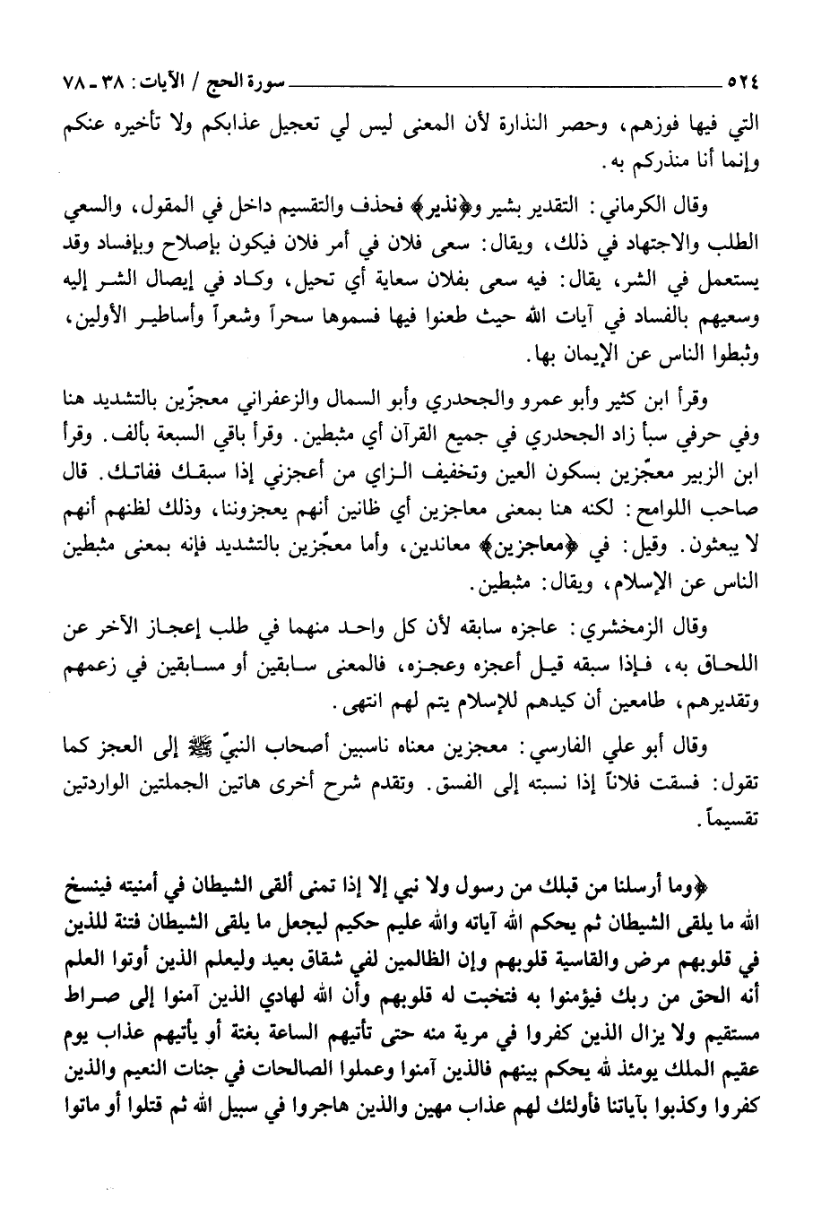 وَقَالَ الْكِرْمَانِيُّ: التَّقْدِيرُ بَشِيرٌ ونَذِيرٌ فَحُذِفَ وَالتَّقْسِيمُ دَاخِلٌ فِي الْمَقُولِ، وَالسَّعْيُ الطَّلَبُ وَالِاجْتِهَادُ فِي ذَلِكَ، وَيُقَالُ: سَعَى فُلَانٌ فِي أَمْرِ فُلَانٍ فَيَكُونُ بِإِصْلَاحٍ وَبِإِفْسَادٍ وَقَدْ يُسْتَعْمَلُ فِي الشَّرِّ، يُقَالُ: فِيهِ سَعَى بِفُلَانٍ سِعَايَةً أَيْ تَحَيَّلَ، وَكَادَ فِي إِيصَالِ الشَّرِّ إِلَيْهِ وَسَعْيِهِمْ بِالْفَسَادِ فِي آيَاتِ اللَّهِ حَيْثُ طَعَنُوا فِيهَا فَسَمُّوهَا سِحْرًا وَشِعْرًا وَأَسَاطِيرَ الْأَوَّلِينَ، وَثَبَّطُوا النَّاسَ عَنِ الْإِيمَانِ بِهَا.