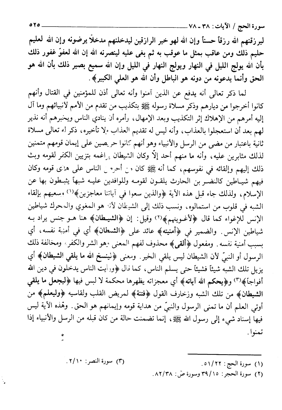 لَمَّا ذَكَرَ تَعَالَى أَنَّهُ يدفع عَنْ الَّذِينَ آمَنُوا وَأَنَّهُ تَعَالَى أَذِنَ لِلْمُؤْمِنِينَ فِي الْقِتَالِ وَأَنَّهُمْ كَانُوا أُخْرِجُوا مِنْ دِيَارِهِمْ وَذَكَرَ مَسْلَاةَ رسوله صلى الله عليه وَسَلَّمَ بِتَكْذِيبِ مَنْ تَقَدَّمَ مِنَ الْأُمَمِ لِأَنْبِيَائِهِمْ وَمَا آلَ إِلَيْهِ أَمْرُهُمْ مِنَ الْإِهْلَاكِ إِثْرَ التَّكْذِيبِ وَبَعْدَ الْإِمْهَالِ، وَأَمَرَهُ أَنْ يُنَادِيَ النَّاسَ وَيُخْبِرَهُمْ أَنَّهُ نَذِيرٌ لَهُمْ بَعْدَ أَنِ اسْتَعْجَلُوا بِالْعَذَابِ، وَأَنَّهُ لَيْسَ لَهُ تَقْدِيمُ الْعَذَابِ وَلَا تَأْخِيرُهُ، ذَكَرَ لَهُ تَعَالَى مَسْلَاةً ثَانِيَةً بِاعْتِبَارِ مَنْ مَضَى مِنَ الرُّسُلِ وَالْأَنْبِيَاءِ وَهُوَ أَنَّهُمْ كَانُوا حَرِيصِينَ عَلَى إِيمَانِ قَوْمِهِمْ مُتَمَنِّينَ لِذَلِكَ مُثَابِرِينَ عَلَيْهِ، وَأَنَّهُ مَا مِنْهُمْ أَحَدٌ إِلَّا وَكَانَ الشَّيْطَانُ يُرَاغِمُهُ بِتَزْيِينِ الْكُفْرِ لِقَوْمِهِ وَبَثِّ ذَلِكَ إِلَيْهِمْ وَإِلْقَائِهِ فِي نُفُوسِهِمْ، كَمَا أَنَّهُ صَلَّى اللَّهُ عَلَيْهِ وَسَلَّمَ كَانَ مِنْ أَحْرَصِ النَّاسِ عَلَى هُدَى قَوْمِهِ وَكَانَ فِيهِمْ شَيَاطِينُ كَالنَّضْرِ بْنِ الْحَارِثِ يُلْقُونَ لِقَوْمِهِ وَلِلْوَافِدِينَ عَلَيْهِ شُبَهًا يُثَبِّطُونَ بِهَا عَنِ الْإِسْلَامِ، وَلِذَلِكَ جَاءَ قَبْلَ هَذِهِ الْآيَةِ وَالَّذِينَ سَعَوْا فِي آياتِنا مُعاجِزِينَ «1» وَسَعْيَهُمْ بِإِلْقَاءِ الشُّبَهِ فِي قُلُوبِ مَنِ اسْتَمَالُوهُ، وَنَسَبَ ذَلِكَ إِلَى الشَّيْطَانِ لِأَنَّهُ هُوَ الْمُغْوِي وَالْمُحَرِّكُ شَيَاطِينَ الْإِنْسِ لِلْإِغْوَاءِ كَمَا قَالَ لَأُغْوِيَنَّهُمْ «2» وَقِيلَ: إِنَّ الشَّيْطانُ هُنَا هُوَ جِنْسٌ يُرَادُ بِهِ شَيَاطِينُ الْإِنْسِ. وَالضَّمِيرُ فِي أُمْنِيَّتِهِ عَائِدٌ عَلَى الشَّيْطانُ أَيْ فِي أُمْنِيَّةِ نَفْسِهِ، أَيْ بِسَبَبِ أُمْنِيَّةِ نَفْسِهِ. وَمَفْعُولُ أَلْقَى مَحْذُوفٌ لِفَهْمِ الْمَعْنَى وَهُوَ الشَّرُّ وَالْكُفْرُ، وَمُخَالَفَةُ ذَلِكَ الرَّسُولِ أَوِ النَّبِيِّ لِأَنَّ الشَّيْطَانَ لَيْسَ يُلْقِي الْخَيْرَ. وَمَعْنَى فَيَنْسَخُ اللَّهُ مَا يُلْقِي الشَّيْطانُ أَيْ يُزِيلُ تِلْكَ الشُّبَهَ شَيْئًا فَشَيْئًا حَتَّى يُسْلِمَ النَّاسُ، كَمَا قَالَ وَرَأَيْتَ النَّاسَ يَدْخُلُونَ فِي دِينِ اللَّهِ أَفْواجاً «3» ويُحْكِمُ اللَّهُ آياتِهِ أَيْ مُعْجِزَاتِهِ يُظْهِرُهَا مُحْكَمَةً لَا لَبْسَ فِيهَا لِيَجْعَلَ مَا يُلْقِي الشَّيْطانُ مِنْ تِلْكَ الشُّبَهِ وَزَخَارِفِ الْقَوْلِ فِتْنَةً لِمَرِيضِ الْقَلْبِ وَلِقَاسِيهِ وَلِيَعْلَمَ مَنْ أُوتِيَ الْعِلْمُ أَنَّ مَا تَمَنَّى الرَّسُولُ وَالنَّبِيُّ مِنْ هِدَايَةِ قَوْمِهِ وَإِيمَانِهِمْ هُوَ الْحَقُّ. وَهَذِهِ الْآيَةُ لَيْسَ فِيهَا إِسْنَادُ شَيْءٍ إِلَى رَسُولِ اللَّهِ صَلَّى اللَّهُ عَلَيْهِ وَسَلَّمَ، إِنَّمَا تَضَمَّنَتْ حَالَةَ مَنْ كَانَ قَبْلَهُ مِنَ الرُّسُلِ وَالْأَنْبِيَاءِ إِذَا تمنوا.