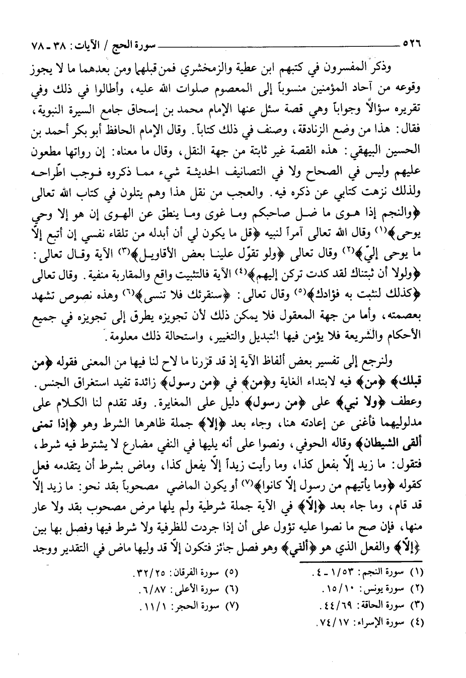 وَذَكَرَ الْمُفَسِّرُونَ فِي كُتُبِهِمُ ابْنُ عَطِيَّةَ وَالزَّمَخْشَرِيُّ فَمَنْ قَبْلَهُمَا وَمَنْ بَعْدَهُمَا مَا لَا يَجُوزُ وُقُوعُهُ مِنْ آحَادِ الْمُؤْمِنِينَ مَنْسُوبًا إِلَى الْمَعْصُومِ صَلَوَاتِ اللَّهِ عَلَيْهِ، وَأَطَالُوا فِي ذَلِكَ وَفِي تَقْرِيرِهِ سُؤَالًا وَجَوَابًا وَهِيَ قِصَّةٌ سُئِلَ عَنْهَا الْإِمَامُ مُحَمَّدُ بْنُ إِسْحَاقَ جَامِعُ السِّيرَةِ النَّبَوِيَّةِ، فَقَالَ: هَذَا مِنْ وَضْعِ الزَّنَادِقَةِ، وَصَنَّفَ فِي ذَلِكَ كِتَابًا. وَقَالَ الْإِمَامُ الْحَافِظُ أَبُو بَكْرٍ أَحْمَدُ بْنُ الْحُسَيْنِ الْبَيْهَقِيُّ: هَذِهِ الْقِصَّةُ غَيْرُ ثَابِتَةٍ مِنْ جِهَةِ النَّقْلِ، وَقَالَ مَا مَعْنَاهُ: إِنَّ رُوَاتَهَا مَطْعُونٌ عَلَيْهِمْ وَلَيْسَ فِي الصِّحَاحِ وَلَا فِي التَّصَانِيفِ الحديثة شَيْءٌ مِمَّا ذَكَرُوهُ فَوَجَبَ اطِّرَاحُهُ وَلِذَلِكَ نَزَّهْتُ كِتَابِي عَنْ ذِكْرِهِ فِيهِ. وَالْعَجَبُ مِنْ نَقْلِ هَذَا وَهُمْ يَتْلُونَ فِي كِتَابِ اللَّهِ تَعَالَى وَالنَّجْمِ إِذا هَوى مَا ضَلَّ صاحِبُكُمْ وَما غَوى وَما يَنْطِقُ عَنِ الْهَوى إِنْ هُوَ إِلَّا وَحْيٌ يُوحى «1» وَقَالَ اللَّهُ تَعَالَى آمِرًا لِنَبِيِّهِ قُلْ مَا يَكُونُ لِي أَنْ أُبَدِّلَهُ مِنْ تِلْقاءِ نَفْسِي إِنْ أَتَّبِعُ إِلَّا مَا يُوحى إِلَيَّ «2» وَقَالَ تَعَالَى وَلَوْ تَقَوَّلَ عَلَيْنا بَعْضَ الْأَقاوِيلِ «3» الْآيَةَ وَقَالَ تَعَالَى: