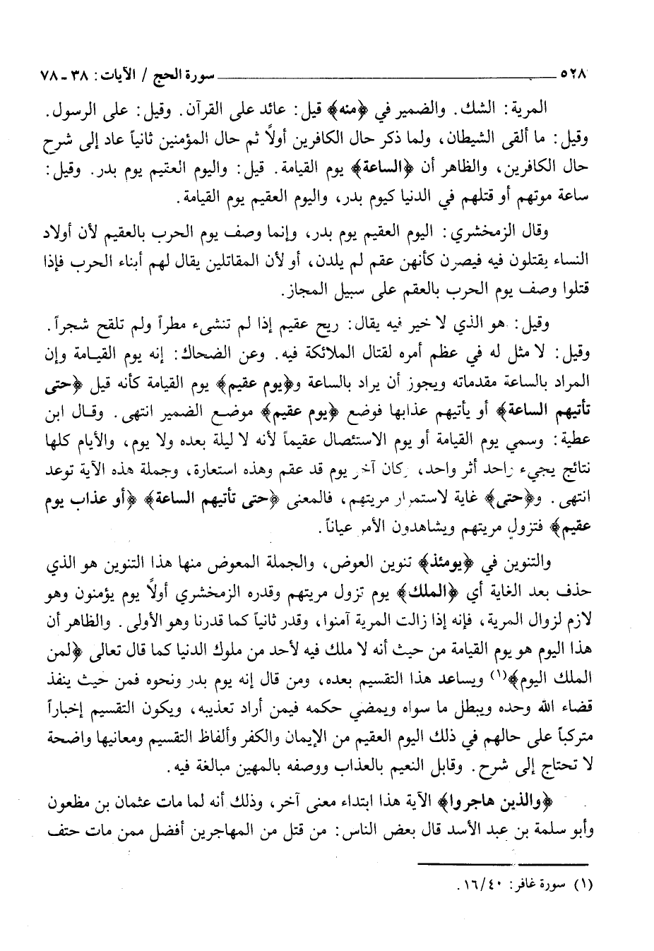 وَقِيلَ: مَا أَلْقَى الشَّيْطَانُ، وَلَمَّا ذَكَرَ حَالَ الْكَافِرِينَ أَوَّلًا ثُمَّ حَالَ الْمُؤْمِنِينَ ثَانِيًا عَادَ إِلَى شَرْحِ حَالِ الْكَافِرِينَ، وَالظَّاهِرُ أَنَّ السَّاعَةُ يَوْمَ الْقِيَامَةِ. قِيلَ: وَالْيَوْمُ الْعَقِيمُ يَوْمُ بَدْرٍ. وَقِيلَ: