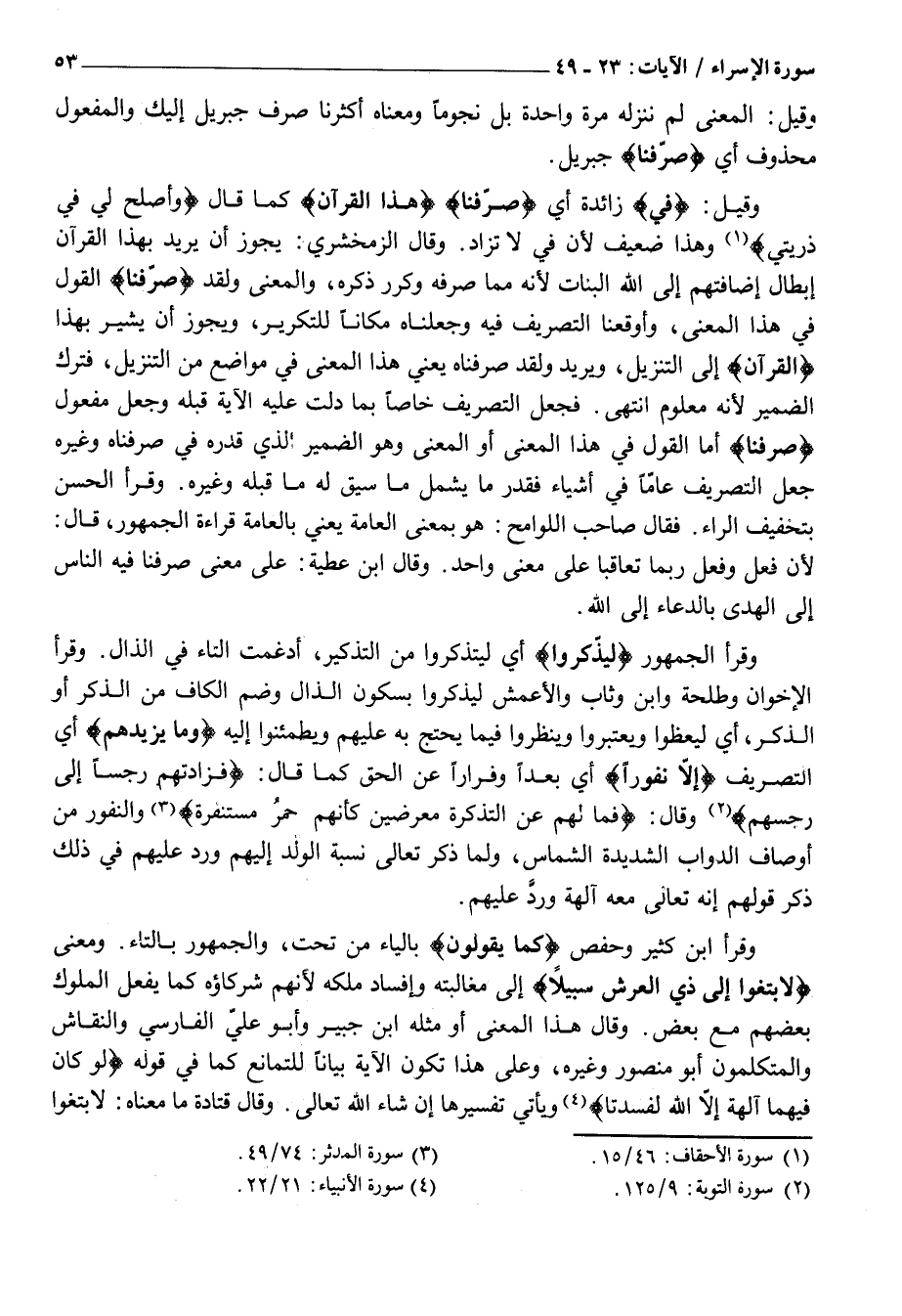 وَقَرَأَ الْجُمْهُورُ لِيَذَّكَّرُوا أَيْ لِيَتَذَكَّرُوا مِنَ التَّذْكِيرِ، أُدْغِمَتِ التَّاءُ فِي الذَّالِ. وَقَرَأَ الْأَخَوَانِ وَطَلْحَةُ وَابْنُ وَثَّابٍ وَالْأَعْمَشُ لِيَذْكُرُوا بِسُكُونِ الذَّالِ وَضَمِّ الْكَافِ مِنَ الذِّكْرِ أو الذكر، أي ليعظوا وَيَعْتَبِرُوا وَيَنْظُرُوا فِيمَا يُحْتَجُّ بِهِ عَلَيْهِمْ وَيَطْمَئِنُّوا إِلَيْهِ وَما يَزِيدُهُمْ أَيِ التَّصْرِيفُ إِلَّا نُفُوراً أَيْ بُعْدًا وَفِرَارًا عَنِ الْحَقِّ كَمَا قَالَ: فَزادَتْهُمْ رِجْساً إِلَى رِجْسِهِمْ «2» وَقَالَ: فَما لَهُمْ عَنِ التَّذْكِرَةِ مُعْرِضِينَ كَأَنَّهُمْ حُمُرٌ مُسْتَنْفِرَةٌ «3» وَالنُّفُورُ مِنْ أَوْصَافِ الدَّوَابِّ الشَّدِيدَةِ الشِّمَاسِ، وَلَمَّا ذَكَرَ تَعَالَى نِسْبَةَ الْوَلَدِ إِلَيْهِمْ وَرَدَّ عَلَيْهِمْ فِي ذَلِكَ ذَكَرَ قَوْلَهُمْ أَنَّهُ تَعَالَى مَعَهُ آلِهَةٌ وَرَدَّ عَلَيْهِمْ.