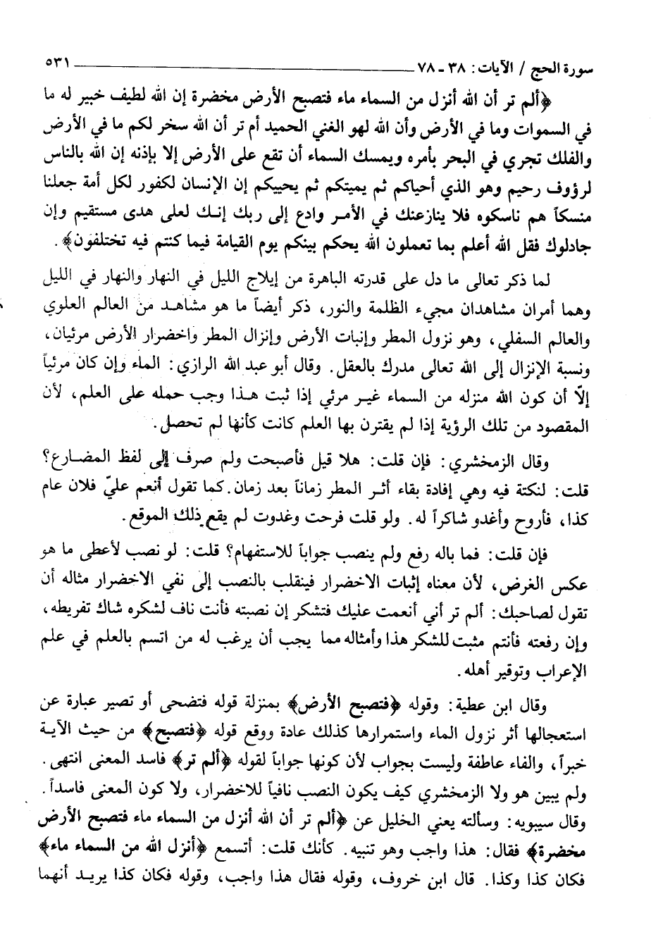 فَإِنْ قُلْتَ: فَمَا بَالُهُ رَفَعَ وَلَمْ يَنْصِبْ جَوَابًا لِلِاسْتِفْهَامِ؟ قُلْتُ: لَوْ نَصَبَ لَأَعْطَى مَا هُوَ عَكْسُ الْغَرَضِ، لِأَنَّ مَعْنَاهُ إِثْبَاتُ الِاخْضِرَارِ فَيَنْقَلِبُ بِالنَّصْبِ إِلَى نَفْيِ الِاخْضِرَارِ مِثَالُهُ أَنْ تَقُولَ لِصَاحِبِكَ: أَلَمْ تَرَ أَنِّي أَنْعَمْتُ عَلَيْكَ فَتَشْكُرَ إِنْ نَصَبْتَهُ فَأَنْتَ نَافٍ لِشُكْرِهِ شَاكٌّ تَفْرِيطَهُ، وَإِنْ رَفَعْتَهُ فَأَنْتُمْ مثبت لِلشُكْرِ هَذَا وَأَمْثَالِهِ مِمَّا يَجِبُ أَنْ يَرْغَبَ لَهُ مَنِ اتَّسَمَ بِالْعِلْمِ فِي عِلْمِ الْإِعْرَابِ وَتَوْقِيرِ أَهْلِهِ.