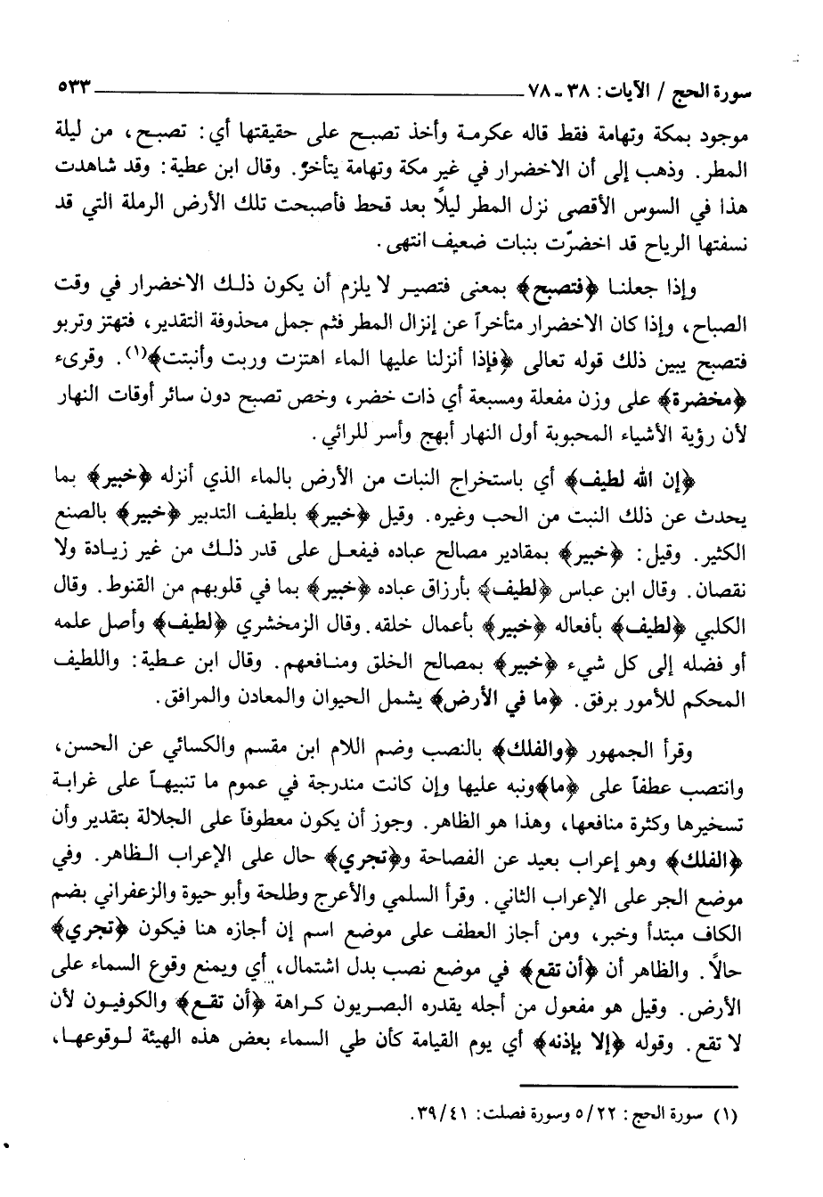 وَقَرَأَ الْجُمْهُورُ وَالْفُلْكَ بِالنَّصْبِ وَضَمَّ اللَّامَ ابْنُ مِقْسَمٍ وَالْكِسَائِيُّ عَنِ الْحَسَنِ، وَانْتَصَبَ عَطْفًا عَلَى مَا وَنَبَّهَ عَلَيْهَا وَإِنْ كَانَتْ مُنْدَرِجَةً فِي عُمُومِ مَا تَنْبِيهًا عَلَى غَرَابَةِ تَسْخِيرِهَا وَكَثْرَةِ مَنَافِعِهَا، وَهَذَا هُوَ الظَّاهِرُ. وَجَوَّزَ أَنْ يَكُونَ مَعْطُوفًا عَلَى الْجَلَالَةِ بِتَقْدِيرِ وَأَنَّ الْفُلْكَ وَهُوَ إِعْرَابٌ بَعِيدٌ عَنِ الفصاحة وتَجْرِي حَالٌ عَلَى الْإِعْرَابِ الظَّاهِرِ. وَفِي مَوْضِعِ الْجَرِّ عَلَى الْإِعْرَابِ الثَّانِي. وَقَرَأَ السُّلَمِيُّ وَالْأَعْرَجُ وَطَلْحَةُ وَأَبُو حَيْوَةَ وَالزَّعْفَرَانِيُّ بِضَمِّ الْكَافِ مُبْتَدَأٌ وَخَبَرٌ، وَمَنْ أَجَازَ الْعَطْفَ عَلَى مَوْضِعِ اسْمِ إِنَّ أَجَازَهُ هُنَا فَيَكُونُ تَجْرِي حَالًا. وَالظَّاهِرُ أَنْ أَنْ تَقَعَ فِي مَوْضِعِ نَصْبِ بَدَلٌ اشْتِمَالٍ، أَيْ وَيَمْنَعُ وُقُوعَ السَّمَاءِ عَلَى الْأَرْضِ. وَقِيلَ هُوَ مَفْعُولٌ مِنْ أَجْلِهِ يُقَدِّرُهُ الْبَصْرِيُّونَ كَرَاهَةَ أَنْ تَقَعَ وَالْكُوفِيُّونَ لِأَنْ لَا تَقَعَ. وَقَوْلُهُ إِلَّا بِإِذْنِهِ أَيْ يَوْمَ الْقِيَامَةِ كَأَنَّ طَيَّ السَّمَاءِ بَعْضَ هذه الهيئة لوقوعها،