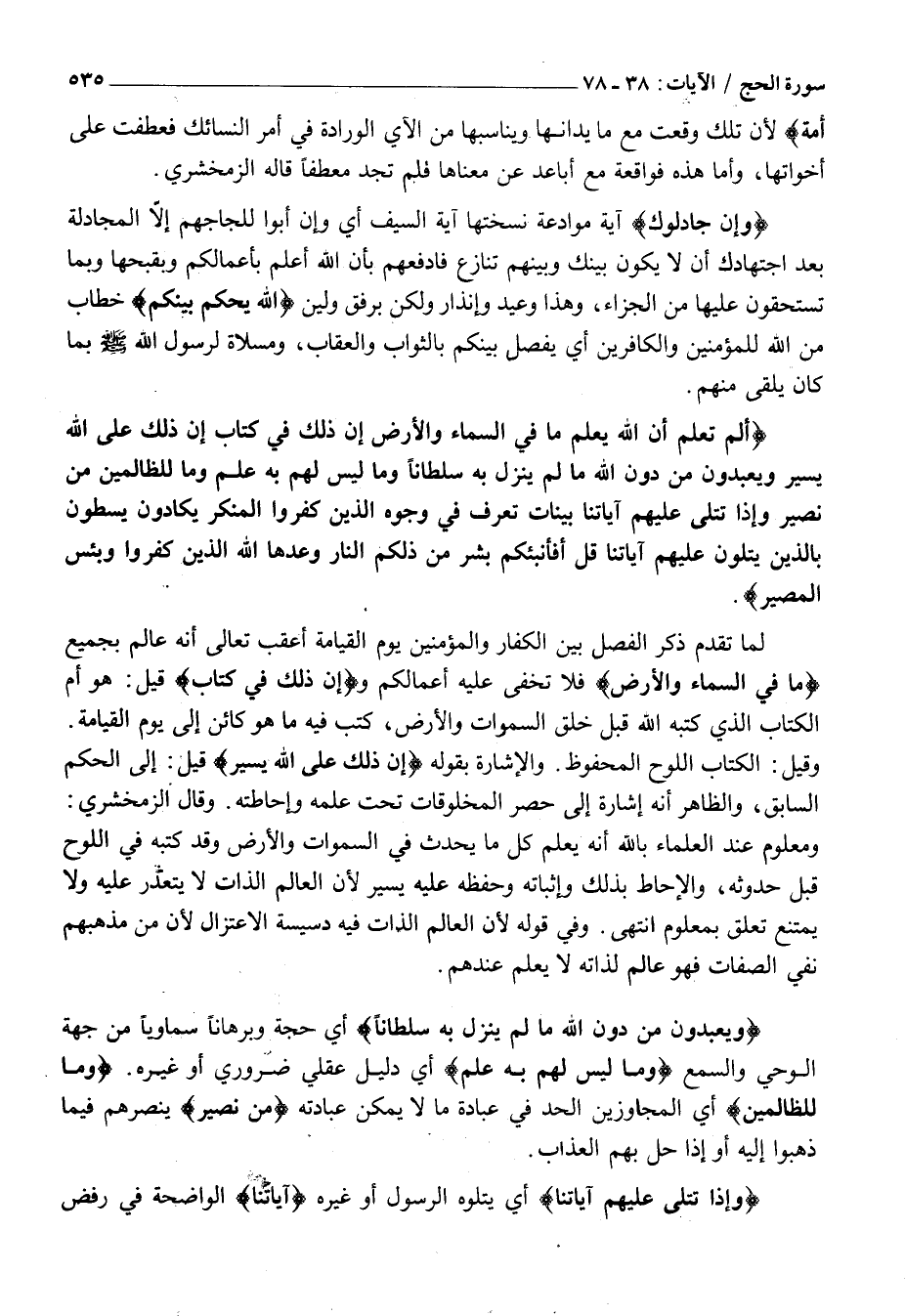 أَلَمْ تَعْلَمْ أَنَّ اللَّهَ يَعْلَمُ مَا فِي السَّماءِ وَالْأَرْضِ إِنَّ ذلِكَ فِي كِتابٍ إِنَّ ذلِكَ عَلَى اللَّهِ يَسِيرٌ وَيَعْبُدُونَ مِنْ دُونِ اللَّهِ مَا لَمْ يُنَزِّلْ بِهِ سُلْطاناً وَما لَيْسَ لَهُمْ بِهِ عِلْمٌ وَما لِلظَّالِمِينَ مِنْ نَصِيرٍ وَإِذا تُتْلى عَلَيْهِمْ آياتُنا بَيِّناتٍ تَعْرِفُ فِي وُجُوهِ الَّذِينَ كَفَرُوا الْمُنْكَرَ يَكادُونَ يَسْطُونَ بِالَّذِينَ يَتْلُونَ عَلَيْهِمْ آياتِنا قُلْ أَفَأُنَبِّئُكُمْ بِشَرٍّ مِنْ ذلِكُمُ النَّارُ وَعَدَهَا اللَّهُ الَّذِينَ كَفَرُوا وَبِئْسَ الْمَصِيرُ.