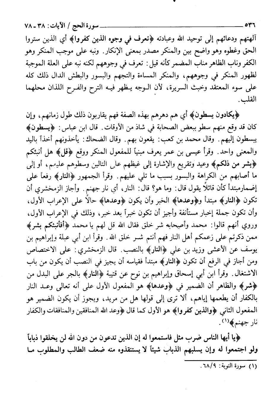 يَكادُونَ يَسْطُونَ أَيْ هُمْ دَهْرَهُمْ بِهَذِهِ الصِّفَةِ فَهُمْ يُقَارِبُونَ ذَلِكَ طُولَ زَمَانِهِمْ، وَإِنْ كَانَ قَدْ وَقَعَ مِنْهُمْ سَطْوٌ بِبَعْضِ الصَّحَابَةِ فِي شَاذٍّ مِنَ الْأَوْقَاتِ. قَالَ ابْنُ عَبَّاسٍ: يَسْطُونَ يَبْسُطُونَ إِلَيْهِمْ. وَقَالَ مُحَمَّدُ بْنُ كَعْبٍ: يَقَعُونَ بِهِمْ. وَقَالَ الضَّحَّاكُ: يَأْخُذُونَهُمْ أَخْذًا بِالْيَدِ وَالْمَعْنَى وَاحِدٌ. وَقَرَأَ عِيسَى بْنُ عُمَرَ يُعْرَفُ مَبْنِيًّا لِلْمَفْعُولِ الْمُنْكَرُ وَوَقَعَ قُلْ هَلْ أُنَبِّئُكُمْ بِشَرٍّ مِنْ ذلِكُمُ وَعِيدٌ وَتَقْرِيعٌ وَالْإِشَارَةُ إِلَى غَيْظِهِمْ عَلَى التَّالِينَ وَسَطْوِهِمْ عَلَيْهِمْ، أَوْ إِلَى مَا أَصَابَهُمْ مِنَ الْكَرَاهَةِ وَالْبُسُورِ بِسَبَبِ مَا تُلِيَ عَلَيْهِمْ. وَقَرَأَ الْجُمْهُورُ النَّارُ رَفْعٌا عَلَى إِضْمَارِ مُبْتَدَأٍ كَأَنَّ قَائِلًا يَقُولُ قَالَ: وَمَا هُوَ؟ قَالَ: النَّارُ، أَيْ نَارُ جَهَنَّمَ. وَأَجَازَ الزَّمَخْشَرِيُّ أَنْ تَكُونَ النَّارُ مبتدأ ووَعَدَهَا الْخَبَرَ وَأَنْ يَكُونَ وَعَدَهَا حَالًا عَلَى الْإِعْرَابِ الْأَوَّلِ، وَأَنْ تَكُونَ جُمْلَةَ إِخْبَارٍ مُسْتَأْنِفَةً وَأُجِيزَ أَنْ تَكُونَ خَبَرًا بَعْدَ خَبَرٍ، وَذَلِكَ فِي الْإِعْرَابِ الْأَوَّلِ، وَرُوِيَ أَنَّهُمْ قَالُوا: مُحَمَّدٌ وَأَصْحَابُهُ شَرُّ خَلْقٍ فَقَالَ اللَّهُ قُلْ لَهُمْ يَا مُحَمَّدُ أَفَأُنَبِّئُكُمْ بِشَرٍّ مِمَّنْ ذَكَرْتُمْ عَلَى زَعْمِكُمْ أَهْلَ النَّارِ فَهُمْ أَنْتُمْ شَرُّ خَلْقِ اللَّهِ. وَقَرَأَ ابْنُ أَبِي عَبْلَةَ وَإِبْرَاهِيمُ بْنُ يُوسُفَ عَنِ الْأَعْشَى وَزَيْدِ بْنِ عَلِيٍّ النَّارُ بِالنَّصْبِ. قَالَ الزَّمَخْشَرِيُّ: عَلَى الِاخْتِصَاصِ وَمَنْ أَجَازَ فِي الرَّفْعِ أَنْ تكون النَّارُ مبتدأ ففياسه أَنْ يُجِيزَ فِي النَّصْبِ أَنْ يَكُونَ مِنْ بَابِ الِاشْتِغَالِ. وَقَرَأَ ابْنُ أَبِي إِسْحَاقَ وَإِبْرَاهِيمُ بْنُ نُوحٍ عَنْ قُتَيْبَةَ النَّارُ بِالْجَرِّ عَلَى الْبَدَلِ مَنْ شَرٍّ وَالظَّاهِرُ أَنَّ الضَّمِيرَ فِي وَعَدَهَا هُوَ الْمَفْعُولُ الْأَوَّلُ عَلَى أَنَّهُ تَعَالَى وَعَدَ النَّارَ بِالْكُفَّارِ أَنْ يُطْعِمَهَا إِيَّاهُمْ، أَلَا تَرَى إِلَى قَوْلِهَا هل من مريد، وَيَجُوزُ أَنْ يَكُونَ الضَّمِيرُ هُوَ الْمَفْعُولَ الثَّانِيَ والَّذِينَ كَفَرُوا هُوَ الْأَوَّلُ كَمَا قَالَ وَعَدَ اللَّهُ الْمُنافِقِينَ وَالْمُنافِقاتِ وَالْكُفَّارَ نارَ جَهَنَّمَ «1» .