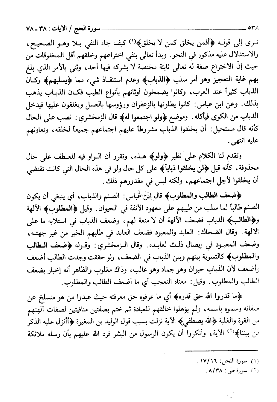 ضَعُفَ الطَّالِبُ وَالْمَطْلُوبُ قَالَ ابْنُ عَبَّاسٍ: الصَّنَمُ وَالذُّبَابُ، أَيْ يَنْبَغِي أن يكون الصنم طَالِبًا لِمَا سُلِبَ مِنْ طِيبِهِمْ عَلَى مَعْهُودِ الْأَنَفَةِ فِي الْحَيَوَانِ. وَقِيلَ الْمَطْلُوبُ الآلهة والطَّالِبُ الذُّبَابُ فَضَعْفُ الْآلِهَةِ أَنْ لَا مَنَعَةَ لَهُمْ، وَضَعْفُ الذُّبَابِ فِي اسْتِلَابِهِ مَا عَلَى الْآلِهَةِ. وَقَالَ الضَّحَّاكُ: الْعَابِدُ وَالْمَعْبُودُ فَضَعْفُ الْعَابِدِ فِي طَلَبِهِمُ الْخَيْرَ مِنْ غَيْرِ جِهَتِهِ، وَضَعْفُ الْمَعْبُودِ فِي إِيصَالِ ذَلِكَ لِعَابِدِهِ. وَقَالَ الزَّمَخْشَرِيُّ: وَقَوْلُهُ ضَعُفَ الطَّالِبُ وَالْمَطْلُوبُ كَالتَّسْوِيَةِ بَيْنَهُمْ وَبَيْنَ الذُّبَابِ فِي الضَّعْفِ، وَلَوْ حَقَّقْتَ وَجَدْتَ الطَّالِبَ أَضْعَفَ وَأَضْعَفَ لِأَنَّ الذُّبَابَ حَيَوَانٌ وَهُوَ جَمَادٌ وَهُوَ غَالِبٌ، وَذَاكَ مَغْلُوبٌ وَالظَّاهِرُ أَنَّهُ إِخْبَارٌ بِضَعْفِ الطَّالِبِ والمطلوب. وقيل: معناه التعجب أي ما أضعف الطالب والمطلوب.