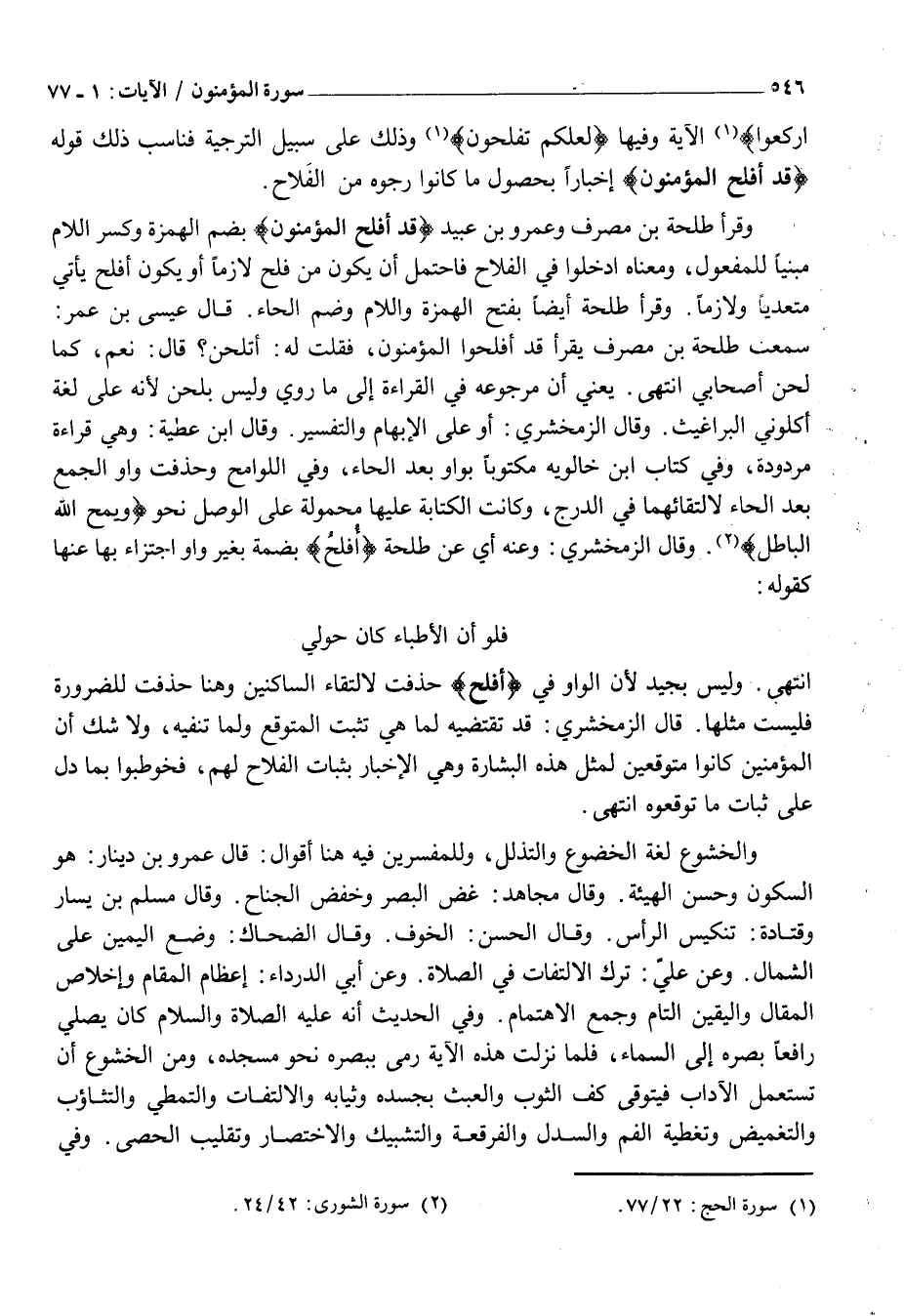 فَلَوْ أَنَّ الْأَطِبَّاءَ كَانَ حَوْلِي انْتَهَى. وَلَيْسَ بِجَيِّدٍ لِأَنَّ الْوَاوَ فِي أَفْلَحَ حُذِفَتْ لِالْتِقَاءِ السَّاكِنَيْنِ وَهُنَا حُذِفَتْ لِلضَّرُورَةِ فَلَيْسَتْ مِثْلَهَا. قَالَ الزَّمَخْشَرِيُّ: قَدْ تَقْتَضِيهِ لِمَا هِيَ تُثْبِتُ الْمُتَوَقَّعَ وَلِمَا تَنْفِيهِ، وَلَا شَكَّ أَنَّ الْمُؤْمِنِينَ كَانُوا مُتَوَقِّعِينَ لِمِثْلِ هَذِهِ الْبِشَارَةِ وَهِيَ الْإِخْبَارُ بِثَبَاتِ الْفَلَاحِ لَهُمْ، فَخُوطِبُوا بِمَا دَلَّ عَلَى ثَبَاتِ مَا تَوَقَّعُوهُ انْتَهَى.