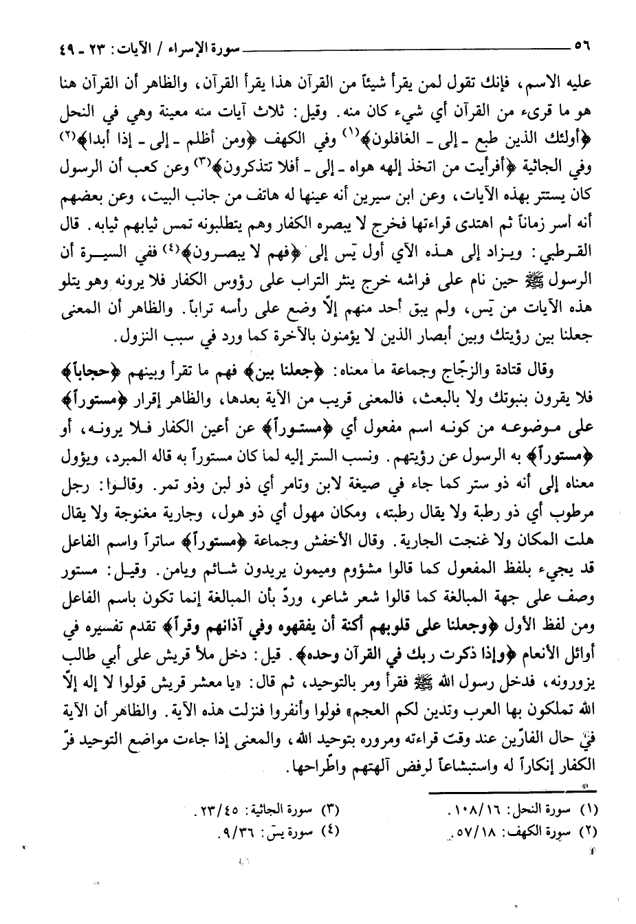 وَقَالَ قَتَادَةُ وَالزَّجَّاجُ وَجَمَاعَةٌ مَا معناه: جَعَلْنا بَيْنَكَ فَهْمِ مَا تَقْرَأُ وَبَيْنَهُمْ حِجاباً فَلَا يُقِرُّونَ بِنُبُوَّتِكَ وَلَا بِالْبَعْثِ، فَالْمَعْنَى قَرِيبٌ مِنَ الْآيَةِ بَعْدَهَا، وَالظَّاهِرُ إِقْرَارُ مَسْتُوراً عَلَى مَوْضُوعِهِ مِنْ كَوْنِهِ اسْمَ مَفْعُولٍ أَيْ مَسْتُوراً عَنْ أَعْيُنِ الْكُفَّارِ فَلَا يَرَوْنَهُ، أَوْ مَسْتُوراً بِهِ الرَّسُولُ عَنْ رُؤْيَتِهِمْ. وَنُسِبَ السَّتْرُ إِلَيْهِ لَمَّا كَانَ مَسْتُورًا بِهِ قَالَهُ الْمُبَرِّدُ، وَيُؤَوَّلُ مَعْنَاهُ إِلَى أَنَّهُ ذُو سَتْرٍ كَمَا جَاءَ فِي صِيغَةِ لَابِنٍ وَتَامِرٍ أَيْ ذُو لَبَنٍ وَذُو تَمْرٍ. وَقَالُوا: رَجُلٌ مَرْطُوبٌ أَيْ ذُو رَطْبَةٍ وَلَا يُقَالُ رَطَّبْتُهُ، وَمَكَانٌ مَهُولٌ أَيْ ذُو هَوْلٍ، وَجَارِيَةٌ مَغْنُوجَةٌ وَلَا يُقَالُ هُلْتُ الْمَكَانَ وَلَا غَنِجَتِ الْجَارِيَةُ. وَقَالَ الْأَخْفَشُ وَجَمَاعَةٌ مَسْتُوراً سَاتِرًا وَاسْمُ الْفَاعِلِ قَدْ يَجِيءُ بِلَفْظِ المفعول كما قالوا مشؤوم وَمَيْمُونٌ يُرِيدُونَ شَائِمٌ وَيَامِنٌ. وَقِيلَ: مَسْتُورٌ وَصْفٌ عَلَى جِهَةِ الْمُبَالَغَةِ كَمَا قَالُوا شِعْرٌ شَاعِرٌ، وَرُدَّ بِأَنَّ الْمُبَالَغَةَ إِنَّمَا تَكُونُ بِاسْمِ الْفَاعِلِ وَمِنْ لَفْظِ الْأَوَّلِ وَجَعَلْنا عَلى قُلُوبِهِمْ أَكِنَّةً أَنْ يَفْقَهُوهُ وَفِي آذانِهِمْ وَقْراً تَقَدَّمَ تَفْسِيرُهُ فِي أَوَائِلِ الْأَنْعَامِ وَإِذا ذَكَرْتَ رَبَّكَ فِي الْقُرْآنِ وَحْدَهُ.