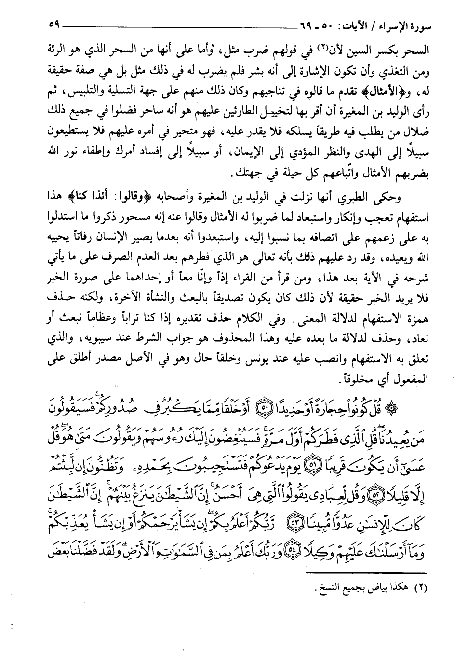 قُلْ كُونُوا حِجارَةً أَوْ حَدِيداً (50) أَوْ خَلْقاً مِمَّا يَكْبُرُ فِي صُدُورِكُمْ فَسَيَقُولُونَ مَنْ يُعِيدُنا قُلِ الَّذِي فَطَرَكُمْ أَوَّلَ مَرَّةٍ فَسَيُنْغِضُونَ إِلَيْكَ رُؤُسَهُمْ وَيَقُولُونَ مَتى هُوَ قُلْ عَسى أَنْ يَكُونَ قَرِيباً (51) يَوْمَ يَدْعُوكُمْ فَتَسْتَجِيبُونَ بِحَمْدِهِ وَتَظُنُّونَ إِنْ لَبِثْتُمْ إِلاَّ قَلِيلاً (52) وَقُلْ لِعِبادِي يَقُولُوا الَّتِي هِيَ أَحْسَنُ إِنَّ الشَّيْطانَ يَنْزَغُ بَيْنَهُمْ إِنَّ الشَّيْطانَ كانَ لِلْإِنْسانِ عَدُوًّا مُبِيناً (53) رَبُّكُمْ أَعْلَمُ بِكُمْ إِنْ يَشَأْ يَرْحَمْكُمْ أَوْ إِنْ يَشَأْ يُعَذِّبْكُمْ وَما أَرْسَلْناكَ عَلَيْهِمْ وَكِيلاً (54)