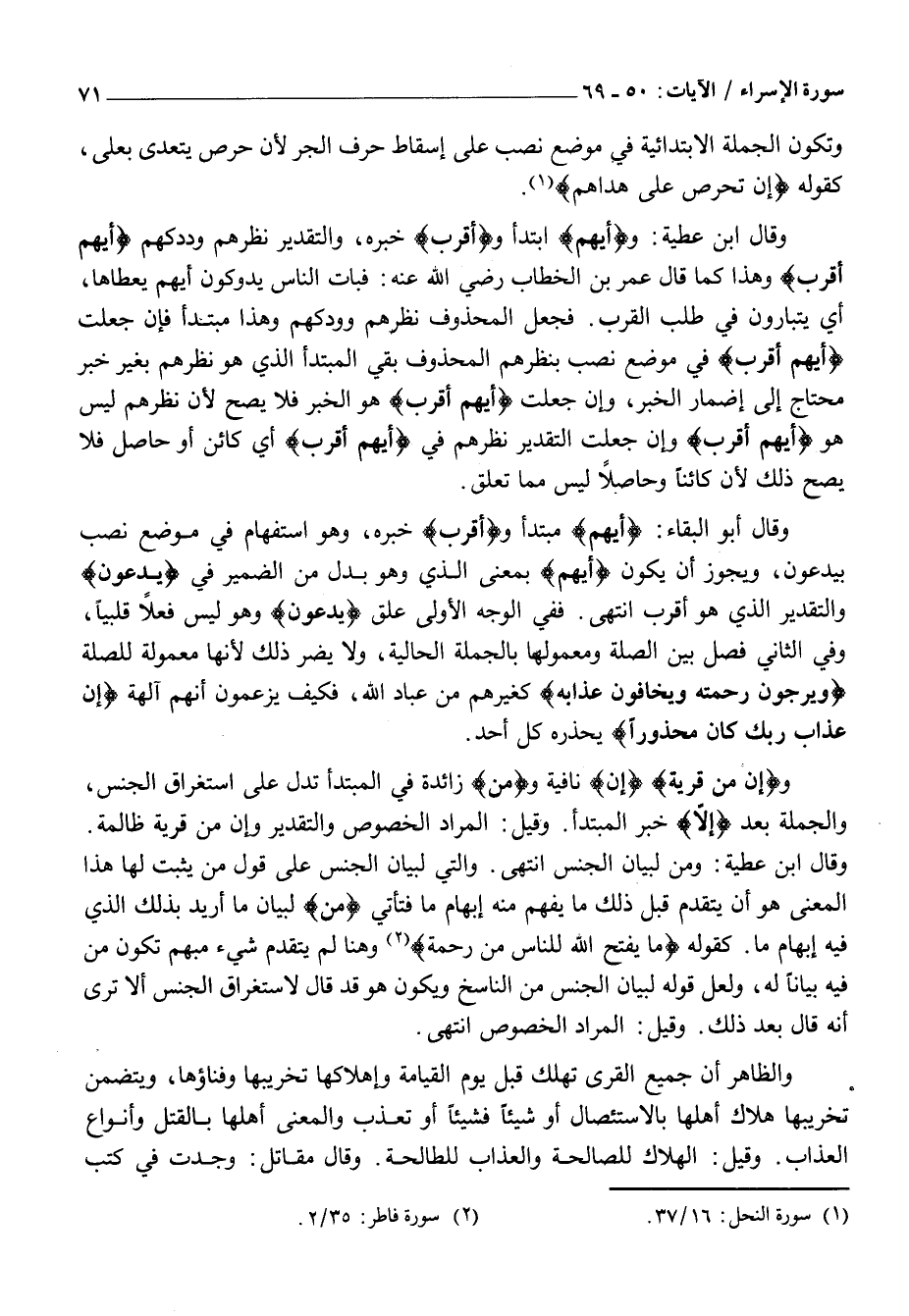 وَقَالَ ابن عطية: وأَيُّهُمْ ابتدأ وأَقْرَبُ خبره، والتقدير نظرهم وددكهم أَيُّهُمْ أَقْرَبُ وَهَذَا كَمَا قَالَ عُمَرُ بْنُ الْخَطَّابِ رَضِيَ اللَّهُ عَنْهُ: فَبَاتَ النَّاسُ يَدُوكُونَ أَيُّهُمْ يُعْطَاهَا، أَيْ يَتَبَارَوْنَ فِي طَلَبِ الْقُرْبِ. فَجَعَلَ الْمَحْذُوفَ نَظَرَهُمْ وَوَدَكَهُمْ وَهَذَا مُبْتَدَأٌ فَإِنْ جَعَلْتَ أَيُّهُمْ أَقْرَبُ فِي مَوْضِعِ نَصْبٍ بِنَظَرِهِمُ الْمَحْذُوفِ بَقِيَ الْمُبْتَدَأُ الَّذِي هُوَ نَظَرُهُمْ بِغَيْرِ خَبَرٍ مُحْتَاجٌ إِلَى إِضْمَارِ الْخَبَرِ، وَإِنْ جَعَلْتَ أَيُّهُمْ أَقْرَبُ هُوَ الْخَبَرَ فَلَا يَصِحُّ لِأَنَّ نَظَرَهُمْ لَيْسَ هُوَ أَيُّهُمْ أَقْرَبُ وَإِنْ جَعَلْتَ التَّقْدِيرَ نَظَرَهُمْ فِي أَيُّهُمْ أَقْرَبُ أَيْ كَائِنٌ أَوْ حَاصِلٌ فَلَا يَصِحُّ ذَلِكَ لِأَنَّ كَائِنًا وَحَاصِلًا لَيْسَ مِمَّا تَعَلَّقَ.