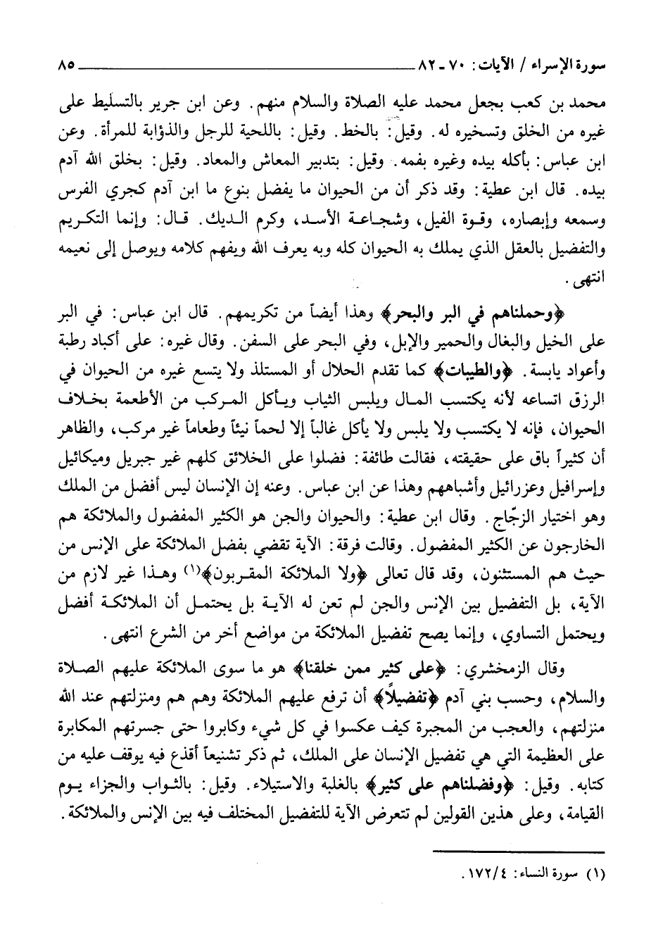 وَقَالَ الزَّمَخْشَرِيُّ: عَلى كَثِيرٍ مِمَّنْ خَلَقْنا هُوَ مَا سِوَى الْمَلَائِكَةِ عَلَيْهِمُ الصَّلَاةُ وَالسَّلَامُ، وَحَسْبُ بَنِي آدَمَ تَفْضِيلًا أَنْ تُرْفَعَ عَلَيْهِمُ الْمَلَائِكَةُ وَهُمْ هُمْ وَمَنْزِلَتُهُمْ عِنْدَ اللَّهِ مَنْزِلَتُهُمْ، وَالْعَجَبُ مِنَ الْمُجْبِرَةِ كَيْفَ عَكَسُوا فِي كُلِّ شَيْءٍ وَكَابَرُوا حَتَّى جَسَرَتْهُمُ الْمُكَابَرَةُ عَلَى الْعَظِيمَةِ الَّتِي هِيَ تَفْضِيلُ الْإِنْسَانِ عَلَى الْمَلَكِ، ثُمَّ ذَكَرَ تَشْنِيعًا أَقْذَعَ فِيهِ يُوقَفُ عَلَيْهِ مِنْ كِتَابِهِ. وَقِيلَ: وَفَضَّلْناهُمْ عَلى كَثِيرٍ بِالْغَلَبَةِ وَالِاسْتِيلَاءِ. وَقِيلَ: بِالثَّوَابِ وَالْجَزَاءِ يَوْمَ الْقِيَامَةِ، وَعَلَى هَذَيْنِ الْقَوْلَيْنِ لَمْ تَتَعَرَّضِ الْآيَةُ لِلتَّفْضِيلِ الْمُخْتَلَفِ فِيهِ بَيْنَ الْإِنْسِ وَالْمَلَائِكَةِ.