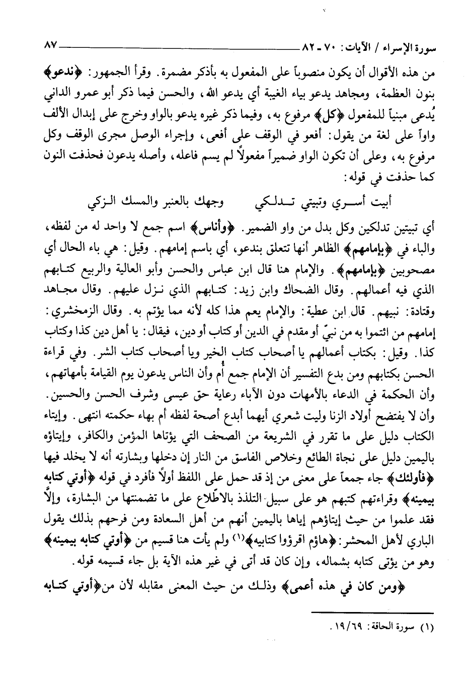 مِنْ هَذِهِ الْأَقْوَالِ أَنَّ يَكُونَ مَنْصُوبًا عَلَى الْمَفْعُولِ بِهِ بِاذْكُرْ مُضْمَرَةً. وَقَرَأَ الجمهور: نَدْعُوا بِنُونِ الْعَظَمَةِ، وَمُجَاهِدٌ يَدْعُو بِيَاءِ الْغَيْبَةِ أَيْ يَدْعُو اللَّهَ، وَالْحَسَنُ فِيمَا ذَكَرَ أَبُو عَمْرٍو الدَّانِيُّ يُدْعَى مَبْنِيًّا لِلْمَفْعُولِ كُلَّ مَرْفُوعٌ بِهِ، وَفِيمَا ذَكَرَ غَيْرُهُ يَدْعُو بِالْوَاوِ وَخُرِّجَ عَلَى إِبْدَالِ الْأَلِفِ وَاوًا عَلَى لُغَةِ مَنْ يَقُولُ: أَفْعُو فِي الْوَقْفِ عَلَى أَفْعَى، وَإِجْرَاءُ الْوَصْلِ مَجْرَى الْوَقْفِ وَكُلُّ مَرْفُوعٌ بِهِ، وَعَلَى أَنْ تَكُونَ الْوَاوُ ضَمِيرًا مَفْعُولًا لَمْ يُسَمَّ فَاعِلُهُ، وَأَصْلُهُ يَدْعُونَ فَحُذِفَتِ النُّونُ كَمَا حُذِفَتْ فِي قَوْلِهِ:
