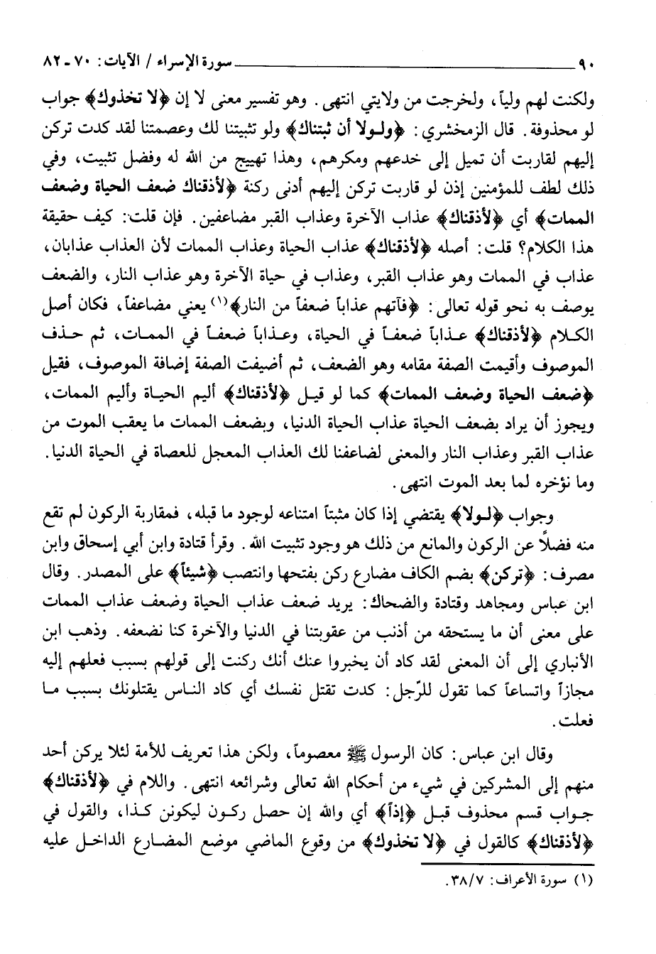 وَلَكُنْتَ لَهُمْ وَلِيًّا، وَلَخَرَجْتَ مِنْ وِلَايَتِي انْتَهَى. وَهُوَ تَفْسِيرُ مَعْنًى لَا أن لَاتَّخَذُوكَ جَوَابُ لَوْ مَحْذُوفَةً. قَالَ الزَّمَخْشَرِيُّ: وَلَوْلا أَنْ ثَبَّتْناكَ ولو تَثْبِيتُنَا لَكَ وَعِصْمَتُنَا لَقَدْ كِدْتَ تَرْكَنُ إِلَيْهِمْ لَقَارَبْتَ أَنْ تَمِيلَ إِلَى خُدَعِهِمْ وَمَكْرِهِمْ، وَهَذَا تَهْيِيجٌ مِنَ اللَّهِ لَهُ وَفَضْلُ تَثْبِيتٍ، وَفِي ذَلِكَ لُطْفٌ لِلْمُؤْمِنِينَ إِذَنْ لَوْ قَارَبْتَ تَرْكَنُ إِلَيْهِمْ أَدْنَى رَكْنَةٍ لَأَذَقْناكَ ضِعْفَ الْحَياةِ وَضِعْفَ الْمَماتِ أَيْ لَأَذَقْناكَ عَذَابَ الْآخِرَةِ وَعَذَابَ الْقَبْرِ مُضَاعَفَيْنِ. فَإِنْ قُلْتَ: كَيْفَ حَقِيقَةُ هَذَا الْكَلَامِ؟ قُلْتُ: أَصْلُهُ لَأَذَقْناكَ عَذَابَ الْحَيَاةِ وَعَذَابَ الْمَمَاتِ لِأَنَّ الْعَذَابَ عَذَابَانِ، عَذَابٌ فِي الْمَمَاتِ وَهُوَ عَذَابُ الْقَبْرِ، وَعَذَابٌ فِي حَيَاةِ الْآخِرَةِ وَهُوَ عَذَابُ النَّارِ، وَالضِّعْفُ يُوصَفُ بِهِ نَحْوَ قَوْلِهِ تَعَالَى: فَآتِهِمْ عَذاباً ضِعْفاً مِنَ النَّارِ «1» يَعْنِي مُضَاعَفًا، فَكَانَ أَصْلُ الْكَلَامِ لَأَذَقْناكَ عَذَابًا ضِعْفًا فِي الْحَيَاةِ، وَعَذَابًا ضِعْفًا فِي الْمَمَاتِ، ثُمَّ حُذِفَ الْمَوْصُوفُ وَأُقِيمَتِ الصِّفَةُ مَقَامَهُ وَهُوَ الضِّعْفُ، ثُمَّ أُضِيفَتِ الصِّفَةُ إِضَافَةَ الْمَوْصُوفِ، فَقِيلَ ضِعْفَ الْحَياةِ وَضِعْفَ الْمَماتِ كَمَا لو قِيلَ لَأَذَقْناكَ أَلِيمَ الْحَيَاةِ وَأَلِيمَ الْمَمَاتِ، وَيَجُوزُ أَنْ يُرَادَ بِضِعْفِ الْحَيَاةِ عَذَابُ الْحَيَاةِ الدُّنْيَا، وَبِضِعْفِ الْمَمَاتِ مَا يَعْقُبُ الْمَوْتَ مِنْ عَذَابِ الْقَبْرِ وَعَذَابِ النَّارِ وَالْمَعْنَى لَضَاعَفْنَا لَكَ الْعَذَابَ الْمُعَجَّلَ لِلْعُصَاةِ فِي الْحَيَاةِ الدُّنْيَا.