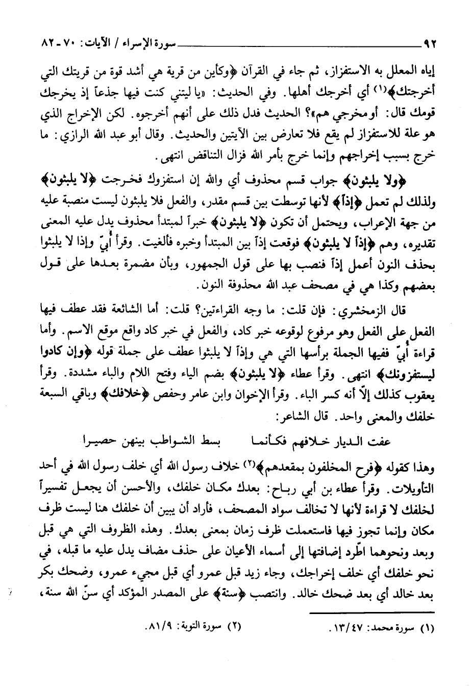 قَالَ الزَّمَخْشَرِيُّ: فَإِنْ قُلْتَ: مَا وَجْهُ الْقِرَاءَتَيْنِ؟ قُلْتُ: أَمَّا الشَّائِعَةُ فَقَدْ عَطَفَ فِيهَا الْفِعْلَ عَلَى الْفِعْلِ وَهُوَ مَرْفُوعٌ لِوُقُوعِهِ خَبَرَ كَادَ، وَالْفِعْلُ فِي خَبَرِ كَادَ وَاقِعٌ مَوْقِعَ الِاسْمِ. وَأَمَّا قِرَاءَةُ أُبَيٍّ فَفِيهَا الْجُمْلَةُ بِرَأْسِهَا الَّتِي هِيَ وَإِذًا لَا يَلْبَثُوا عَطْفٌ عَلَى جُمْلَةِ قَوْلِهِ وَإِنْ كادُوا لَيَسْتَفِزُّونَكَ انْتَهَى. وَقَرَأَ عَطَاءٌ لَا يَلْبَثُونَ بِضَمِّ الْيَاءِ وَفَتْحِ اللَّامِ وَالْبَاءِ مُشَدَّدَةٍ. وَقَرَأَ يَعْقُوبُ كَذَلِكَ إِلَّا أَنَّهُ كَسَرَ الْبَاءَ. وَقَرَأَ الْأَخَوَانِ وَابْنُ عَامِرٍ وَحَفْصٌ خِلافَكَ وَبَاقِي السَّبْعَةِ خَلْفَكَ وَالْمَعْنَى وَاحِدٌ. قَالَ الشَّاعِرُ: