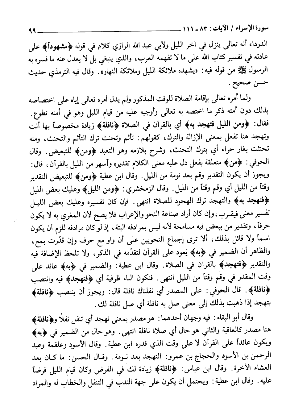 وَيَجُوزُ أَنْ يَكُونَ التَّقْدِيرُ وَقُمْ بَعْدَ نَوْمَةٍ مِنَ اللَّيْلِ. وَقَالَ ابْنُ عَطِيَّةَ وَمِنَ لِلتَّبْعِيضِ التَّقْدِيرُ وَقْتًا مِنَ اللَّيْلِ أَيْ وَقُمْ وَقْتًا مِنَ اللَّيْلِ. وَقَالَ الزَّمَخْشَرِيُّ: وَمِنَ اللَّيْلِ وَعَلَيْكَ بَعْضَ اللَّيْلِ فَتَهَجَّدْ بِهِ وَالتَّهَجُّدُ تَرْكُ الْهُجُودِ لِلصَّلَاةِ انْتَهَى. فَإِنْ كَانَ تَفْسِيرُهُ وَعَلَيْكَ بَعْضَ اللَّيْلِ تَفْسِيرَ مَعْنًى فَيَقْرُبُ، وَإِنْ كَانَ أَرَادَ صِنَاعَةَ النَّحْوِ وَالْإِعْرَابِ فَلَا يَصِحُّ لِأَنَّ الْمُغْرَى بِهِ لَا يَكُونُ حَرْفًا، وَتَقْدِيرُ مِنْ بِبَعْضٍ فِيهِ مُسَامَحَةٌ لِأَنَّهُ لَيْسَ بِمُرَادِفِهِ أَلْبَتَّةَ، إِذْ لَوْ كَانَ مُرَادِفَهُ لَلَزِمَ أَنْ يَكُونَ اسْمًا وَلَا قَائِلَ بِذَلِكَ، أَلَا تَرَى إِجْمَاعَ النَّحْوِيِّينَ عَلَى أَنَّ وَاوَ مَعَ حَرْفٌ وَإِنْ قُدِّرَتْ بِمَعَ، وَالظَّاهِرُ أَنَّ الضَّمِيرَ فِي بِهِ يَعُودُ عَلَى الْقُرْآنِ لِتَقَدُّمِهِ فِي الذِّكْرِ، وَلَا تُلْحَظُ الْإِضَافَةُ فِيهِ وَالتَّقْدِيرُ فَتَهَجَّدْ بِالْقُرْآنِ فِي الصَّلَاةِ. وَقَالَ ابْنُ عَطِيَّةَ: وَالضَّمِيرُ فِي بِهِ عَائِدٌ عَلَى وَقْتِ الْمُقَدَّرِ فِي وَقُمْ وَقْتًا مِنَ اللَّيْلِ انْتَهَى. فَتَكُونُ الْبَاءُ ظَرْفِيَّةً أَيْ فَتَهَجَّدْ فِيهِ وَانْتُصِبَ نافِلَةً. قَالَ الْحَوْفِيُّ: عَلَى الْمَصْدَرِ أَيْ نَفَّلْنَاكَ نَافِلَةً قَالَ: وَيَجُوزُ أَنْ يَنْتَصِبَ نافِلَةً بِتَهَجَّدْ إِذَا ذَهَبْتَ بِذَلِكَ إِلَى مَعْنَى صَلِّ بِهِ نَافِلَةً أَيْ صَلِّ نَافِلَةً لَكَ.