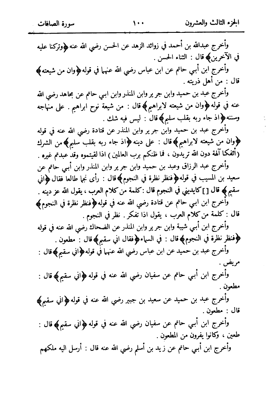 وَأخرج ابْن أبي حَاتِم عَن سُفْيَان رَضِي الله عَنهُ فِي قَوْله {إِنِّي سقيم} قَالَ: طعين وَكَانُوا يفرون من المطعون