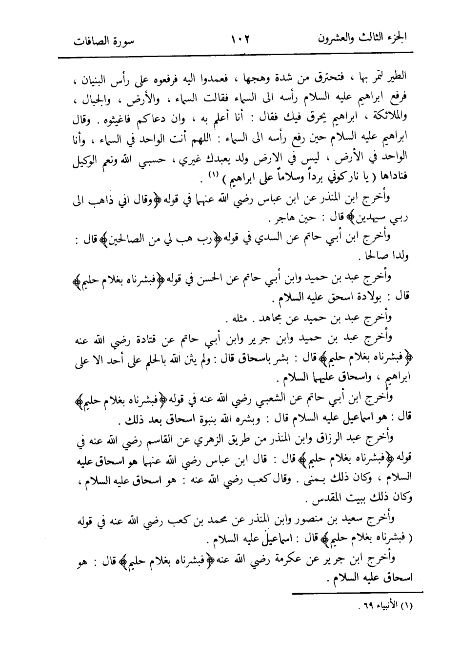 وَأخرج عبد الرَّزَّاق وَابْن الْمُنْذر من طَرِيق الزُّهْرِيّ عَن الْقَاسِم رَضِي الله عَنهُ فِي قَوْله {فبشرناه بِغُلَام حَلِيم} قَالَ: قَالَ ابْن عَبَّاس رَضِي الله عَنْهُمَا هُوَ إِسْحَاق عَلَيْهِ السَّلَام وَكَانَ ذَلِك بمنى