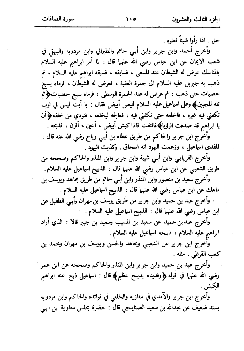 وَأخرج الْفرْيَابِيّ وَابْن أبي شيبَة وَابْن جرير وَابْن الْمُنْذر وَالْحَاكِم وَصَححهُ من طَرِيق الشّعبِيّ عَن ابْن عَبَّاس رَضِي الله عَنْهُمَا قَالَ: الذَّبِيح إِسْمَاعِيل عَلَيْهِ السَّلَام