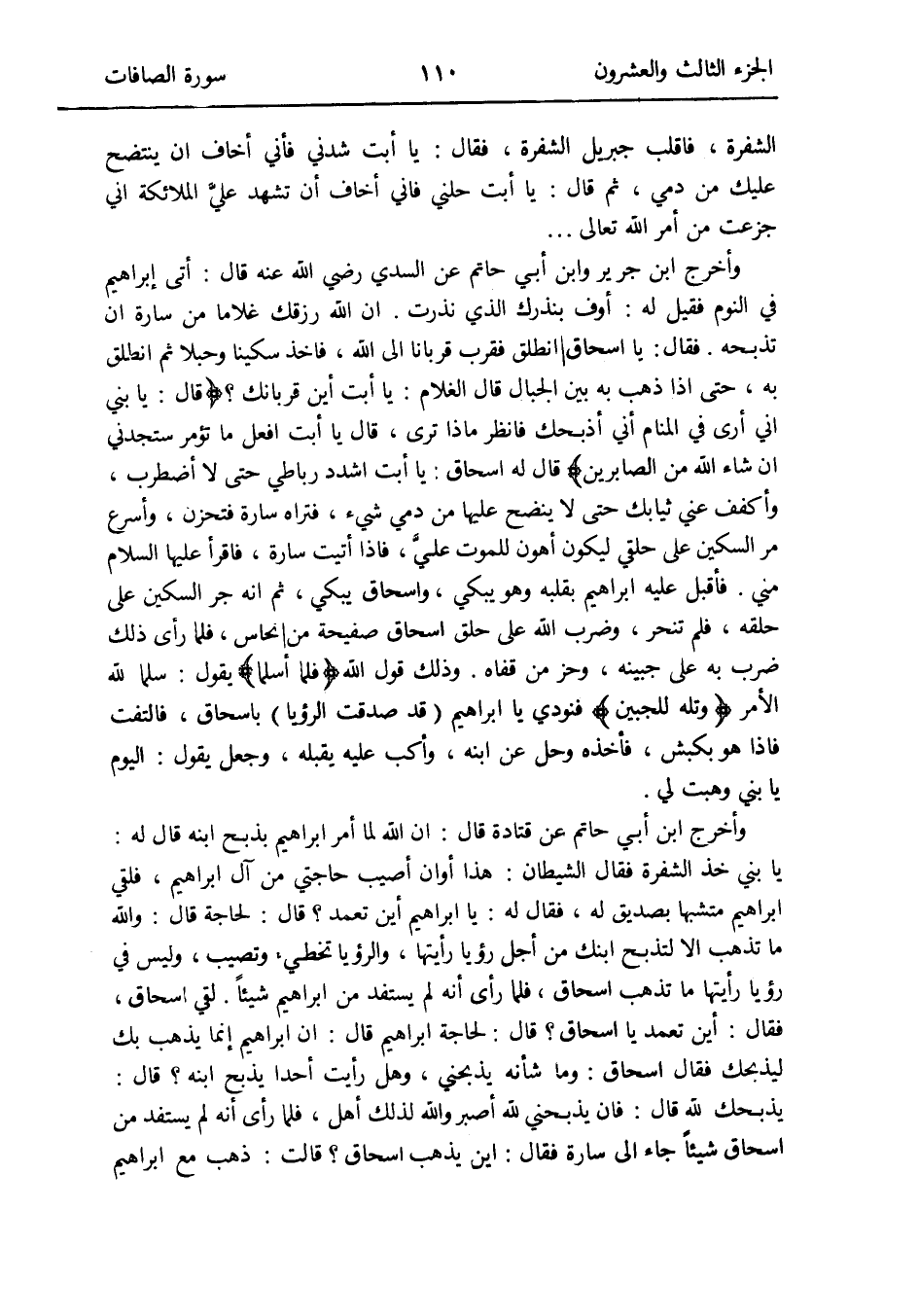 وَأخرج ابْن أبي حَاتِم عَن قَتَادَة قَالَ: إِن الله لما أَمر إِبْرَاهِيم بِذبح ابْنه قَالَ لَهُ: يَا بني خُذ الشَّفْرَة فَقَالَ الشَّيْطَان: هَذَا أَوَان أُصِيب حَاجَتي من آل إِبْرَاهِيم فلقي إِبْرَاهِيم متشبهاً بصديق لَهُ فَقَالَ لَهُ: يَا إِبْرَاهِيم أَيْن تعمد قَالَ: لحَاجَة قَالَ: وَالله مَا تذْهب إِلَّا لتذبح ابْنك من أجل رُؤْيا رَأَيْتهَا والرؤيا تخطىء وتصيب وَلَيْسَ فِي رُؤْيا رَأَيْتهَا مَا تذْهب إِسْحَاق فَلَمَّا رأى أَنه لم يستفد من إِبْرَاهِيم شَيْئا